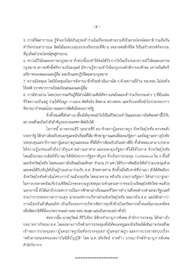 ทั้งนี้ เลขาธิการสภาผู้แทนราษฎร ได้กล่าวให้โอวาทกับคณะครูและนักเรียน ในฐานะบุคคลต้นแบบด้านวินัยรับผิดชอบเพื่อเป็นแนวทางในการพัฒนาการเรียนรู้ของคณะ และบรรยายพิเศษเรื่อง เลขาธิการสภาผู้แทนราษฎรได้รับรางวัลคุณธรรมอวอร์ด ปี 2564 ประเภทบุคคล ด้านวินัยรับผิดชอบ เมื่อวันพฤหัสบดีที่ 25 ส.ค. 65 จากศูนย์คุณธรรม (องค์การมหาชน) ในงานสมัชชาคุณธรรมแห่งชาติ ครั้งที่ 12 ณ กระทรวงวัฒนธรรม โดยได้กล่าวต้อนรับคณะครูและนักเรียนด้วยความยินดีเป็นอย่างยิ่งเพราะถือว่าเราได้รับเกียรติจากยุวชนที่จะเป็นกำลังของชาติมาศึกษาดูงานและเยี่ยมชมรัฐสภา และได้เล่าถึงชีวิตในวัยเด็ก วัยเรียน ที่ได้มีความมุ่งมั่นตั้งใจศึกษาเล่าเรียนและทำหน้าที่ของตนเองให้ดีที่สุด พร้อมทั้งได้เล่าประสบการณ์ทำงานที่ได้เคยทำงานเป็นครูผู้ช่วยที่ จ.สุโขทัย เป็นเวลา 6 เดือน ก่อนเข้ามาทำงานที่สำนักงานเลขาธิการสภาผู้แทนราษฎร ตั้งแต่สมัยที่เข้ามาทำงานใหม่ ๆ และมีคติประจำตัวคือทำหน้าที่ของตนเองให้ดีที่สุด นี่คือวิถีที่สร้างตนเองจนกระทั่งเติบโตมาถึงทุกวันนี้ รวมทั้งวิถีการใช้ชีวิตที่พอเพียง และในระหว่างที่ทำงานตั้งแต่เป็นข้าราชการตัวเล็ก ๆ ตนได้รับความชื่นชมจากผู้ที่ได้ร่วมงานด้วยโดยตนเป็นผู้นำสร้างนวัตกรรม เริ่มเรียนรู้สิ่งใหม่ ๆ สร้างกระบวนความคิด การเปลี่ยนแปลงงานในทุกหน่วยที่ตนได้เข้าไปร่วมงาน ซึ่งการประสบความสำเร็จในหน้าที่การงานของตนนั่นเป็นผลมาจากการรู้หน้าที่ของตนเอง ทำหน้าที่ของตนเองให้ดีที่สุด ใช้วิถีชีวิตอย่างพอเพียง รู้หลักการครองตน ครองคน ครองงาน การใช้ชีวิตภายใต้กฎระเบียบ กฎหมาย ข้อบังคับต่าง ๆ จึงทำให้มีความก้าวหน้าในชีวิตราชการ และกล่าวถึงการได้รับเข็มเกียรติยศจากมหาวิทยาลัยธรรมศาสตร์ที่ทางมหาวิทยาลัยธรรมศาสตร์มอบให้เมื่อปี 2564 ในฐานะศิษย์เก่าดีเด่น เพื่อให้น้อง ๆ ได้เห็นว่าเมื่อเราตั้งใจเรียน ตั้งใจประกอบอาชีพ อยู่ในกรอบคุณงามความดีแล้วเราจะประสบความสำเร็จ และเมื่อปี 2565 ตนได้รับการยกย่องให้เป็นศิษย์เก่าดีเด่นในวาระครบรอบ 50 ปีของโรงเรียนบดินทรเดชา (สิงห์ สิงหเสนี) ทั้งยังได้กล่าวถึงการเรียนรู้ว่า การที่เราเรียนรู้ให้มากนั้นเป็นเรื่องที่ดีและเราสามารถเรียนรู้ได้ตลอดชีวิต โดยเฉพาะเรื่องของภาษาซึ่งเป็นเรื่องที่สำคัญ เป็นการเติมคุณค่าให้ตนเอง โดยเฉพาะอย่างยิ่ง ปัจจุบันทุกคนสามารถเรียนรู้ได้ง่าย การที่เรารู้ภาษามากจะเป็นข้อได้เปรียบในสภาวะการแข่งขันที่ต่อไปเราสามารถนำมาใช้ในวิชาชีพที่เ