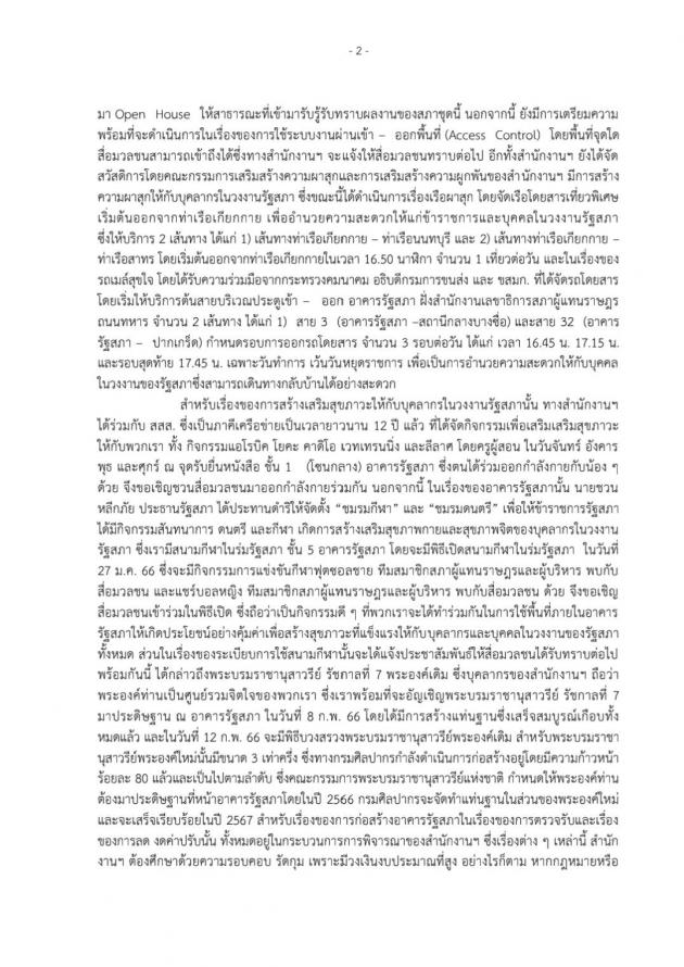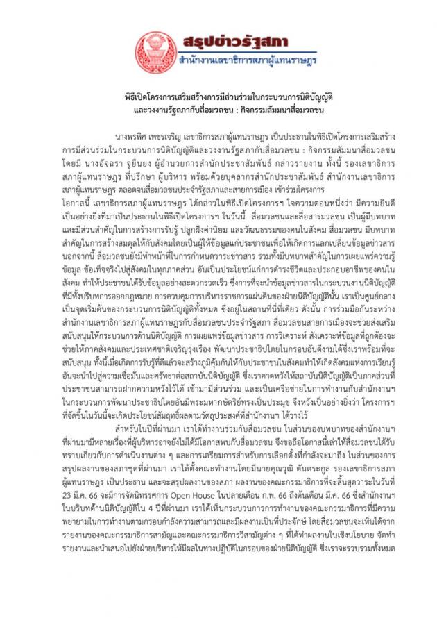 สภาผู้แทนราษฎร ตลอดจนสื่อมวลชนประจำรัฐสภาและสายการเมือง เข้าร่วมโครงการ (รายละเอียดตามเอกสารแนบ)