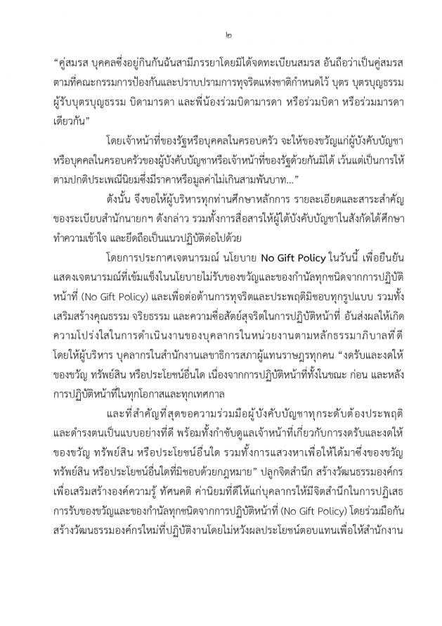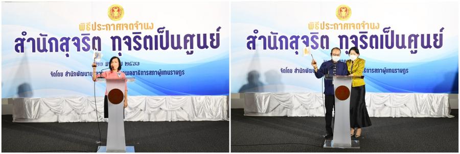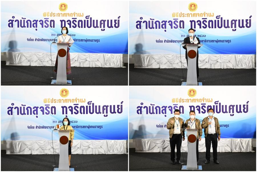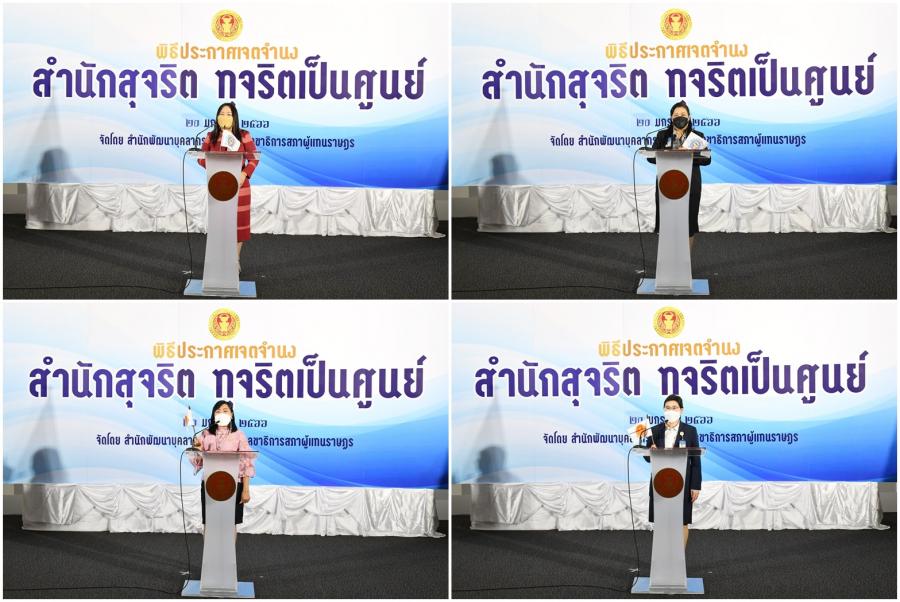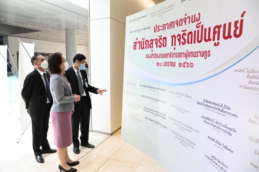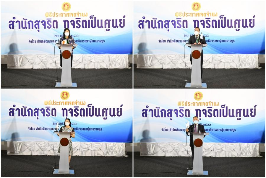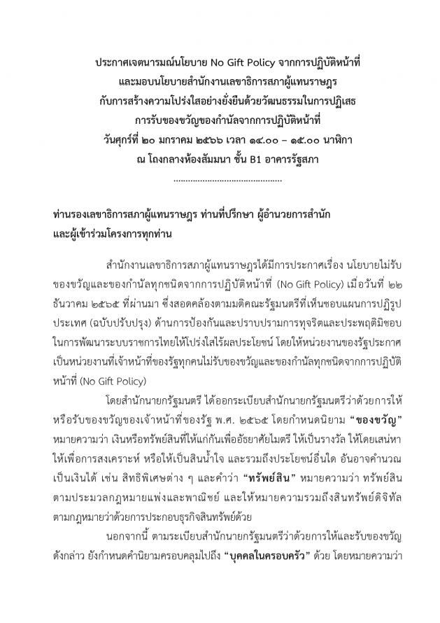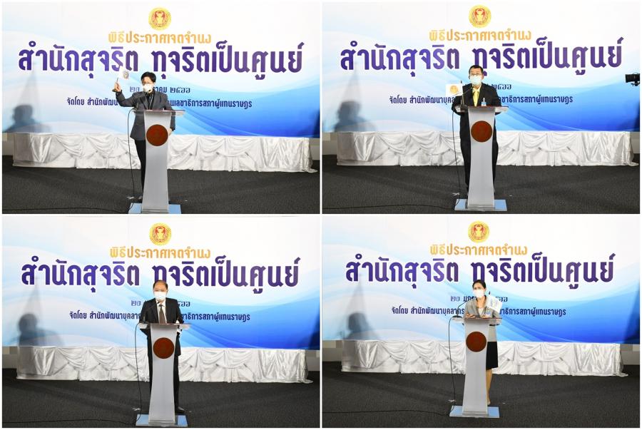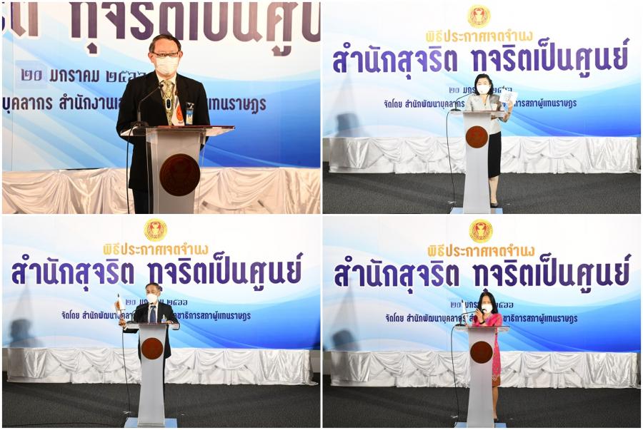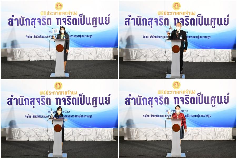 จากนั้น เลขาธิการสภาผู้แทนราษฎรประกาศเจตนารมณ์นโยบาย No Gift Policy จากการปฏิบัติหน้าที่และมอบนโยบายสำนักงานเลขาธิการสภาผู้แทนราษฎรกับการสร้างความโปร่งใสอย่างยั่งยืนด้วยวัฒนธรรมในการปฏิเสธการรับของขวัญของกำนัลจากการปฏิบัติหน้าที่ และมอบมอบธงสุจริต สำนักสุจริต : ทุจริตเป็นศูนย์ ให้หน่วยงานภายใน 27 หน่วยงาน (23 สำนัก 4 กลุ่มงาน) และในเวลา 15.00 น. สำนัก/กลุ่มงาน อ่านคำประกาศเจตจำนงด้านคุณธรรมจริยธรรมและความโปร่งใสของสำนัก/กลุ่มงานโครงการดังกล่าว จัดโดยสำนักพัฒนาบุคลากร โดยมีวัตถุประสงค์เพื่อให้หน่วยงานภายใน 27 หน่วยงาน (23 สำนัก 4 กลุ่มงาน) ประกาศเจตจำนงเป็นสำนักสุจริต : ทุจริตเป็นศูนย์ (Zero Corruption) ให้ความสำคัญในการป้องกันและต่อต้านการทุจริตทุกรูปแบบปฏิบัติงานด้วยความโปร่งใส ไร้สินบน รวมทั้งเสริมสร้างการเป็นเครือข่ายและมีบทบาทในการเฝ้าระวัง (Watch and Voice) โดยการมีส่วนร่วมในการป้องกันและต่อต้านการทุจริตในหน่วยงาน รณรงค์และเผยแพร่สร้างการรับรู้ด้านการป้องกันและปราบปรามการทุจริตการเฝ้าระวัง และการต่อต้านการทุจริตและไม่ทน ไม่เพิกเฉยต่อการทุจริต สร้างการตระหนักรู้ถึงโทษและภัยของการทุจริตให้แก่บุคลากรของสำนักงานเลขาธิการสภาผู้แทนราษฎร เสริมสร้างความรู้เกี่ยวกับการป้องกันและปราบปรามการทุจริตและประพฤติมิชอบ ให้กับเครือข่ายภายในทั้ง 27 หน่วยงานในสังกัดตามแผนการดำเนินงานด้านคุณธรรมจริยธรรมและความโปร่งใสของสำนักงาน