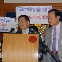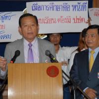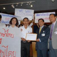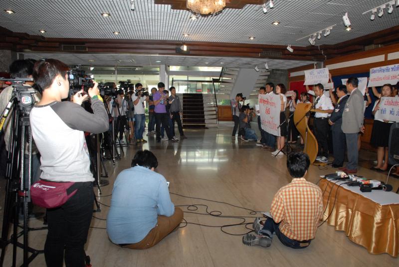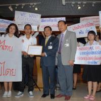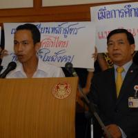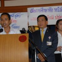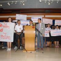 นายอลงกรณ์ พลบุตร เลขานุการวิปสปช. และนายไพโรจน์ พรหมสาส์น ประธานกมธ.วิสามัญจัดทำวิสัยทัศน์และออกแบบอนาคตประเทศไทย รับยื่นหนังสือจากกลุ่มเสียงจากคนหนุ่มสาว