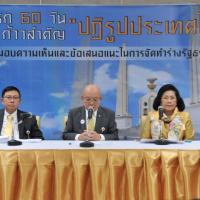 วันศุกร์ที่ ๑๙ ธันวาคม ๒๕๕๗ เวลา ๑๓.๐๐ นาฬิกา ณ ห้องประชุมคณะกรรมาธิการ หมายเลข ๒๑๓-๒๑๖ ชั้น ๒ อาคารรัฐสภา ๒ นายเทียนฉาย กีระนันทน์ ประธานสภาปฏิรูปแห่งชาติ พร้อมด้วยศาสตราจารย์บวรศักดิ์ อุวรรณโณ รองประธานสภาปฏิรูปแห่งชาติ คนที่หนึ่ง และรองศาสตราจารย์ทัศนา บุญทอง รองประธานสภาปฏิรูปแห่งชาติ คนที่สอง ร่วมกันแถลงข่าวภายหลังเสร็จสิ้นพิธีส่งมอบรายงานสรุปความเห็นและข้อเสนอแนะในการจัดทำร่างรัฐธรรมนูญของสภาปฏิรูปแห่งชาติต่อคณะกรรมาธิการยกร่างรัฐธรรมนูญ โดยประธานสภาปฏิรูปแห่งชาติ กล่าวว่า การทำงานของสภาปฏิรูปตามที่รัฐธรรมนูญแห่งราชอาณาจักรไทย (ฉบับชั่วคราว) พุทธศักราช ๒๕๕๗ มีภารกิจสำคัญ ๒ ประการคือการดำเนินการเกี่ยวกับการจัดทำร่างรัฐธรรมนูญ และการปฏิรูปประเทศในด้านต่าง ๆ ซึ่งในการดำเนินการเกี่ยวกับการจัดทำร่างรัฐธรรมนูญก้าวแรกคือการเสนอความคิดเห็นและข้อเสนอแนะต่อคณะกรรมาธิการยกร่างรัฐธรรมนูญภายใน ๖๐ วันนับแต่วันที่ประชุมสภาปฏิรูปครั้งแรกได้ดำเนินการเสร็จสิ้นแล้ว สำหรับการปฏิรูปประเทศในด้านต่าง ๆ นั้นเป็นภารกิจสำคัญที่สภาปฏิรูปจะต้องดำเนินการคู่ขนานกันไปกับการยกร่างรัฐธรรมนูญ โดยนับตั้งแต่วันพรุ่งนี้ (๒๐ ธ.ค. ๕๗) เป็นต้นไปได้มีการกำหนดกรอบในการปฏิรูปไว้เป็น ๓ ส่วน ได้แก่