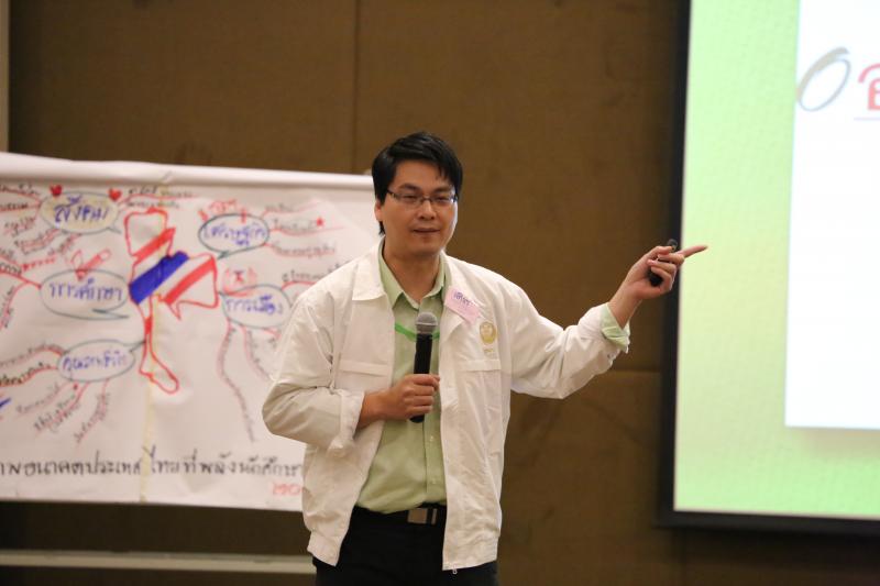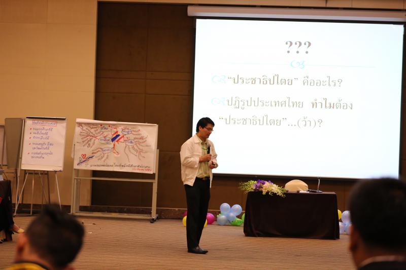 วันอาทิตย์ที่ ๒๑ ธันวาคม ๒๕๕๗ ณ ห้องประชุมวายุภักษ์ โรงแรมเซ็นทราศูนย์ราชการฯ ซึ่งเป็นวันที่สองของโครงการเสวนาเรื่อง สานพลังนักศึกษาเพื่อปฏิรูปประเทศไทย โดยในช่วงเช้าเป็นการอภิปรายเพื่อทบทวนกติกาและมอบโจทย์การเสวนาให้กับกลุ่มนักศึกษาที่เข้าร่วมเวทีประชาเสวนา เพื่อมองอดีตเป็นบทเรียน โดยมีนายสติธร ธนานิธิโชติ นักวิชาการสำนักวิจัยและพัฒนาสถาบันพระปกเกล้าเป็นวิทยากรบรรยายให้ความรู้เรื่องประชาธิปไตย รวมถึงประเด็นปัญหาต่างๆในสังคมไทยที่ควรปฏิรูป ให้กับกลุ่มนักศึกษาที่เข้าร่วมโครงการ ก่อนที่จะแบ่งกลุ่มเพื่อระดมความคิด ในประเด็นภาพที่พึงปรารถนาของประเทศไทยในอนาคต แล้วเราในฐานะเป็นกลุ่มพลังนักศึกษาจะช่วยกันทำให้สิ่งเหล่านี้เป็นจริงได้อย่างไร และจะมีส่วนร่วมในการปฏิรูปอย่างไร เพื่อประเทศไทยเป็นแบบในฝันมีภาพอนาคตในแบบที่ทุกคนต้องการ |
