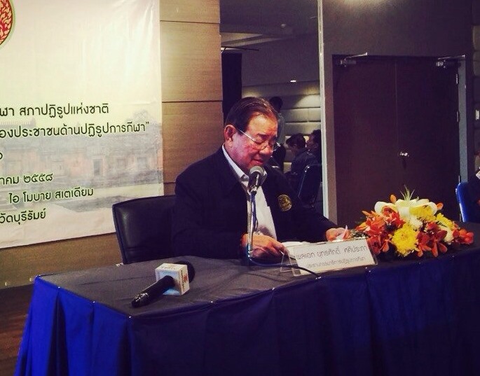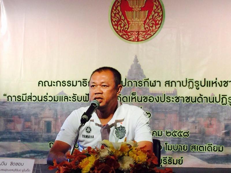วันศุกร์ที่ ๘ พฤษภาคม ๒๕๕๘ เวลา ๐๙.๐๐ นาฬิกา ณ ห้องประชุม (Ballroom) ชั้น ๒ สนาม ไอ โมบาย สเตเดียม อำเภอเมือง จังหวัดบุรีรัมย์ พลเอก ยุทธศักดิ์ ศศิประภา ประธานกรรมาธิการปฏฺิรูปการกีฬา กล่าวเปิดการสัมมนาเรื่อง การมีส่วนร่วมและรับฟังความคิดเห็นของประชาชนด้านปฏฺิรูปการกีฬา ครั้งที่ ๖ และมีการบรรยายพิเศษ เรื่อง "การบริหารจัดการกีฬาเพื่อการพัฒนาเศรษฐกิจของท้องถิ่นและประเทศ" โดย นายเนวิน ชิดชอบ ประธานบริหารสโมสรฟุตบอลบุรีรัมย์ ยูไนเต็ด