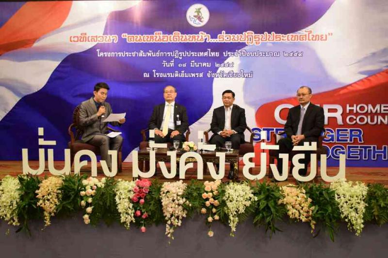 | วันศุกร์ที่ ๑๘ มีนาคม ๒๕๕๙ ตั้งแต่เวลา ๐๙.๐๐ ๑๒.๐๐ น. ณ ห้องเชียงใหม่ รร.ดิเอ็มเพรส จ.เชียงใหม่ นายอลงกรณ์ พลบุตร รองประธาน สปท.คนที่หนึ่ง เดินทางไปร่วมเวทีเสวนาเรื่อง "คนเหนือเดินหน้า...ร่วมปฏิรูปประเทศ ในประเด็นเกี่ยวกับโครงสร้างการขับเคลื่อนการปฏิรูปประเทศ แม่น้ำ ๕ สาย บทบาทหน้าที่ของ สปท. โรดแมป การปฏิรูปประเทศ และการดำเนินงานตามขั้นตอน ความสำคัญของยุทธศาสตร์ชาติ ๒๐ ปี และ ประชาชนจะมีส่วนร่วมขับเคลื่อนประเทศให้เดินหน้าได้อย่างไร โดยมี พลอากาศเอก คณิต สุวรรณเนตร ประธาน กมธ.ขับเคลื่อนฯ ด้านการสื่อสารมวลชน ร่วมเสวนาในประเด็นการขับเคลื่อนและการปฏิรูปด้านการสื่อสารมวลชน ที่มา ขั้นตอนของการกำหนดประเด็นการขับเคลื่อนและการปฏิรูป และการมีส่วนร่วมของภาคการสื่อสารมวลชน และภาคประชาชน และนายประวิน พัฒนะพงษ์ รองอธิบดีกรมประชาสัมพันธ์ ร่วมเสวนาในประเด็นการดำเนินงานของกรมประชาสัมพันธ์ในการสร้างความรู้ความเข้าใจ และการมีส่วนร่วมของประชาชนในการปฏิรูปประเทศไทย รวมทั้งบทบาทของสื่อมวลชนทุกแขนงในการร่วมกันสร้างประเทศไทยให้มั่นคง มั่งคั่ง ยั่งยืน ซึ่งผู้เข้าร่วมรับฟังการเสวนา ได้แก่ สื่อมวลชน อาสาสมัครประชาสัมพันธ์ประจำหมู่บ้านในพื้นที่ ๘ จ. ภาคเหนือตอนบน ส่วนราชการ และประชาชนในพื้นที่ จ.เชียงใหม่ จำนวน ๑๒๐ คน โดยมีวัตถุประสงค์เพื่อให้กลุ่มเป้าหมาย ได้รับความรู้ ความเข้าใจ และเห็นความสำคัญ รวมทั้งมีส่วนร่วมในการปฏิรูปประเทศไทย รวมทั้งให้สื่อมวลชนนำข้อมูลที่ได้จากการเสวนาไปขยายผลผ่านสื่อต่าง ๆ ในสังกัด ให้ประชาชนได้รับทราบในวงกว้าง โดยนายอลงกรณ์ พลบุตร รองประธาน สปท.คนที่หนึ่ง ได้กล่าวถึงการปฏิรูปประเทศ ที่ได้เดินไปตามโรดแมป ระยะที่ ๒ ของรัฐบาล ที่กำหนดให้เดือนต.ค.๕๘ ถึง ก.ค.๖๐ เป็นปีแห่งการปฏิรูปประเทศ ซึ่ง สปท.ได้ส่งแผนปฏิรูปถึงนายกรัฐมนตรี และมีมติเห็นชอบแล้ว ๓๐ แผนปฏิรูป ครอบคลุมทั้ง ๑๑ สาขา ที่ผ่านการขับเคลื่อนโดยแม่น้ำ ๕ สาย และถือเป็นครั้งแรกในประวัติศาสตร์การเมืองไทยในรอบ ๘๔ ปี ที่มีการผลิตกฎหมายที่จำเป็นต่อการบริหารประเทศ และปฏิรูปประเทศมากที่สุด อีกทั้งยังได้กล่าวถึงประเด็นเร่งด่วนในการปฏิรูปประเทศขณะนี้ คือ การปฏิรูปการเมือง การบริหารราชการแผ่นดิน เศรษฐกิจ การบังคับใช้กฎหมาย การศึกษาและการพัฒนาทรัพยากรมนุษย์ ขณะเดียวกันในสัปดาห์หน้าจะนัดหารือร่วมกับผู้บัญชาการตำรวจแห่งชาติ ถึงแผนการปฏิรูปตำรวจ ซึ่งนายกรัฐมนตรีได้เห็นชอบในหลักการแล้ว เพราะโรงพัก คือต้นน้ำแห่งสาย