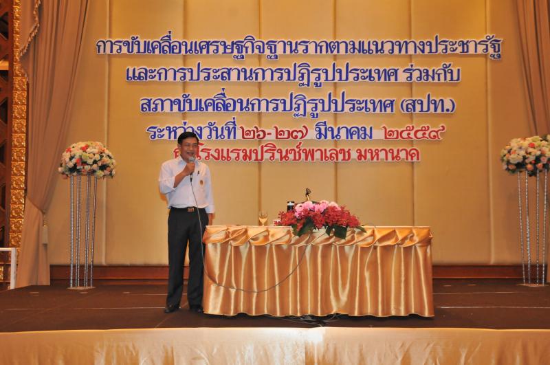 วันอาทิตย์ที่ ๒๗ มีนาคม ๒๕๕๙ เวลา ๑๓.๐๐ นาฬิกา ณ โรงแรมปริ๊นซ์พาเลซ กรุงเทพมหานคร นายอลงกรณ์ พลบุตร รองประธานสภาขับเคลื่อนการปฏิรูปประเทศ คนที่หนึ่ง ในฐานะประธานคณะกรรมการประสานงานขับเคลื่อนการปฏิรูปประเทศ และประธานคณะกรรมการบริหารเครือข่ายร่วมขับเคลื่อนการปฏิรูปประเทศ บรรยายเรื่อง แนวทางการขับเคลื่อนการปฏิรูปประเทศและความร่วมมือระหว่างสภาขับเคลื่อนการปฏิรูปประเทศกับขบวนการองค์กรชุมชน โดยมีสมาชิกสภาขับเคลื่อนการปฏิรูปประเทศ ในฐานะคณะกรรมการบริหารเครือข่ายร่วมขับเคลื่อนการปฏิรูปประเทศ ได้แก่ นายกษิดิ์เดชธนทัต เดชขุนทด นายอัครินทร์ เลิศกิจชัยศิริ พร้อมด้วย พลเอก ดร. กิตติศักดิ์ รัฐประเสริฐ และดร. อาณัฐชัย รัตตกุล คณะกรรมการบริหารหารเครือข่ายร่วมขับเคลื่อนการปฏิรูปประเทศ ร่วมพบปะหารือกับเครือข่ายขบวนองค์กรชุมชน ๗๗ จังหวัด เพื่อหารือความร่วมมือในการเป็นเครือข่ายสภาขับเคลื่อนการปฏิรูปประเทศกับสภาขับเคลื่อนการปฏิรูปประเทศ ในการสัมมนาเรื่อง การขับเคลื่อนเศรษฐกิจฐานรากตามแนวทางประชารัฐ และการประสานงานการปฏิรูปประเทศ โดยมีวัตถุประสงค์เพื่อสร้างความเข้าใจแนวทางการขับเคลื่อนเศรษฐกิจฐานรากตามแนวทางประชารัฐ เพื่อออกแบบระบบการบริหารงานเชิงพื้นที่ของขบวนองค์กรชุมชน และเพื่อประสานเชื่อมโยงการขับเคลื่อนการปฏิรูปประเทศ ซึ่งกลุ่มเป้าหมายมีจำนวน ๓๖๐ คน ประกอบด้วย ผู้แทนในคณะทำงานดำเนินการโครงงานเพิ่มความเข้มแข็งของเศรษฐกิจฐานรากตามแนวทางประชารัฐ ผู้แทนภาคชุมชนในการประสานการทำงานร่วมกับจังหวัดบูรณาการ ผู้แทนขบวนจังหวัด ๗๗ จังหวัด และคณะประสานงานองค์กรชุมชน จัดโดย เครือข่ายบวนองค์กรชุมชน ๗๗ จังหวัด