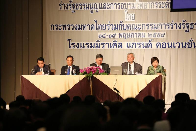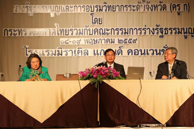 | วันพุธที่ ๑๘ พฤษภาคม ๒๕๕๙ เวลา ๑๑.๐๐ นาฬิกา ณ โรงแรมมิราเคิล แกรนด์ คอนเวนชั่น กรุงเทพฯ นายปกรณ์ นิลประพันธ์ เลขานุการ กรธ. คนที่หนึ่ง นายธิติพันธุ์ เชื้อบุญชัย และนางจุรี วิจิตรวาทการ กรธ. ร่วมกันบรรยาย เรื่อง สิทธิเสรีภาพ สิทธิสตรี หน้าที่ของรัฐ และแนวนโยบายแห่งรัฐ จากนั้น ในเวลา ๑๑.๐๐ น. นายศุภชัย ยาวะประภาษ พลตรี วีระ โรจนวาศ นายภุมรัตน์ ทักษาดิพงศ์ นายเธียรชัย ณ นคร และ นางกีระณา สุมาวงศ์ กรธ. ร่วมกันบรรยาย เรื่อง การปฏิรูปประเทศ |