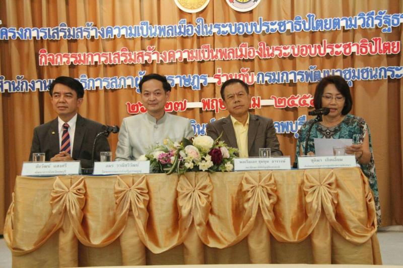 วันศุกร์ที่ ๒๗ พฤษภาคม ๒๕๕๙ เวลา ๑๐.๐๐ - ๑๒.๐๐ น. พลเรือเอก ชุมนุม อาจวงษ์ สมาชิกสภานิติบัญญัติแห่งชาติ ดร.อมร วาณิชวิวัฒน์ โฆษกกรรมการร่างรัฐธรรมนูญ นายชัยวัฒน์ แสงศรี พัฒนาการ จังหวัดลพบุรี เป็นวิทยากรเสวนา โดยมี นางชุติมา เกิดเอี่ยม สังกัดกองบัญชาการศูนย์สงครามพิเศษ ค่ายสมเด็จพระนารายณ์มหาราช เป็นผู้ดำเนินรายการเสวนา เรื่อง พลเมืองกับการมีส่วนร่วมในการปฏิรูปประเทศ ในกิจกรรมการเสริมสร้างความเป็นพลเมืองในระบอบประชาธิปไตย ณ โรงแรมลพบุรีอินท์รีสอร์ท อำเภอเมือง จังหวัดลพบุรี |
