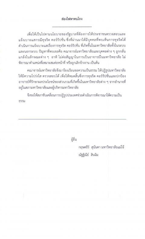 วันพุธที่ ๑๔ กันยายน ๒๕๕๙ เวลา ๑๐.๐๐ น.ณ บริเวณห้องโถง อาคารรัฐสภา ๑ พลเรือเอก พะจุณณ์ ตามประทีป รองประธานกรรมาธิการวิสามัญขับเคลื่อนการปฏิรูปประเทศด้านการป้องกันและปราบปรามการทุจริตและประพฤติมิชอบ คนที่หนึ่ง รับยื่นหนังสือ เรื่อง ส่องไฟหาคนโกง จาก ผศ.ดร. รัฐกรณ์ คิดการ ประธานที่ประชุมประธานสภาคณาจารย์ และข้าราชการแห่งประเทศไทย (ทปสท.)พร้อมตัวแทนมหาวิทยาลัยต่างๆเพื่อร้องเรียนขอความเป็นธรรม ให้ปฏิรูปมหาวิทยาลัยให้มีความโปร่งใส ตรวจสอบได้ เพื่อให้หมดสิ้นซึ่งความทุจริตและคอร์รัปชัน รวมทั้งเพื่อปกป้องอาจารย์ที่รักษาผลประโยชน์ของส่วนรวมที่เกิดขึ้นในมหาวิทยาลัยต่างๆ (รายละเอียด ตามเอกสารแนบ) |