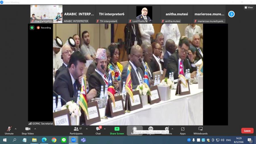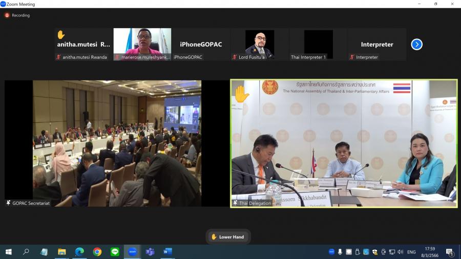 เมื่อวันพุธที่ 8 มีนาคม 2566 เวลา 14.00 นาฬิกา (ตามเวลาประเทศไทย) ณ ห้องประชุมสำนักองค์การรัฐสภาระหว่างประเทศ ชั้น 3 อาคารรัฐสภา ผู้แทนรัฐสภาไทย นำโดย นายสุทา ประทีป ณ ถลาง นายธีรัจชัย พันธุมาศ สมาชิกสภาผู้แทนราษฎร และ น.ส.วิไลลักษณ์ อรินทมะพงษ์ สมาชิกวุฒิสภา เข้าร่วมการประชุมเสวนาของรัฐสภาเกี่ยวกับอนุสัญญาสหประชาชาติว่าด้วยการต่อต้านการทุจริต ปี 2566 ผ่านสื่ออิเล็กทรอนิกส์จากประเทศไทย