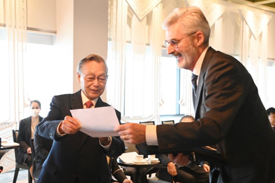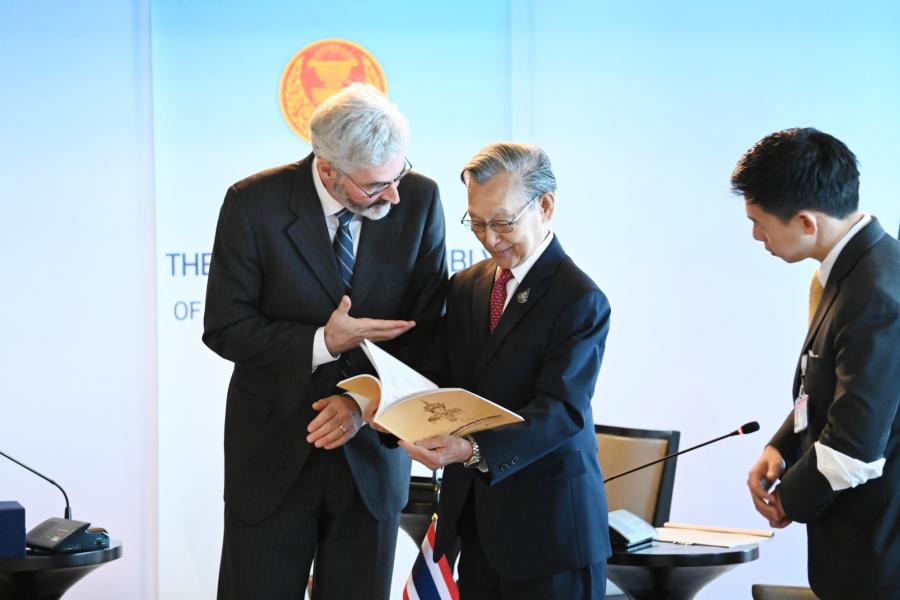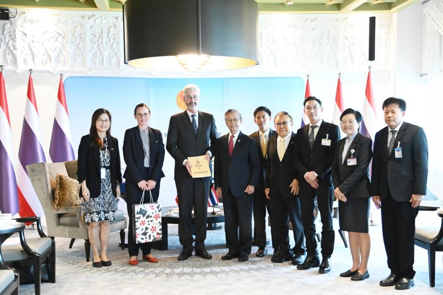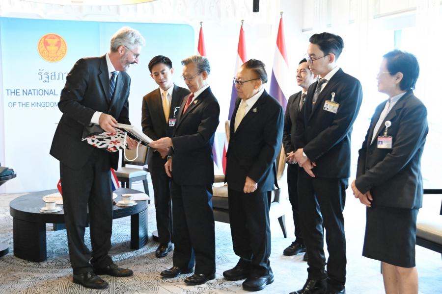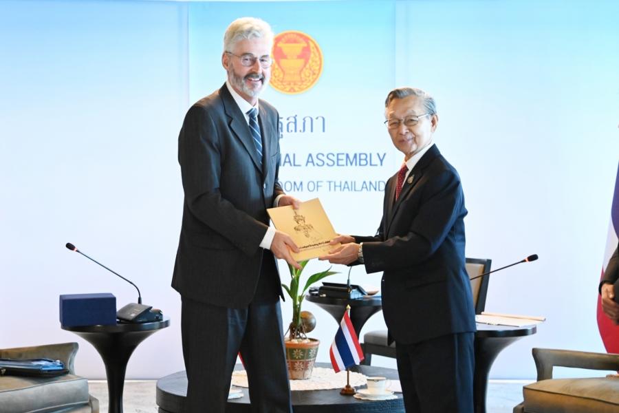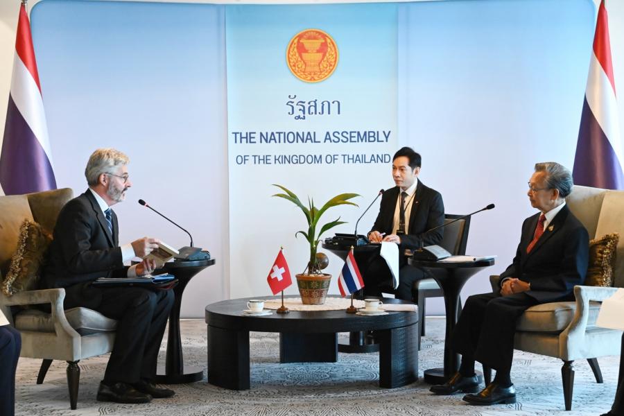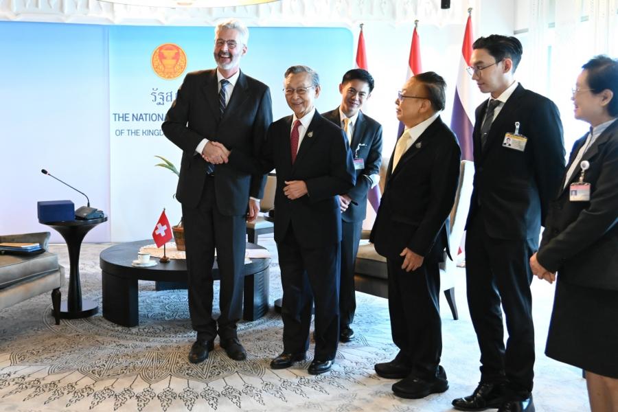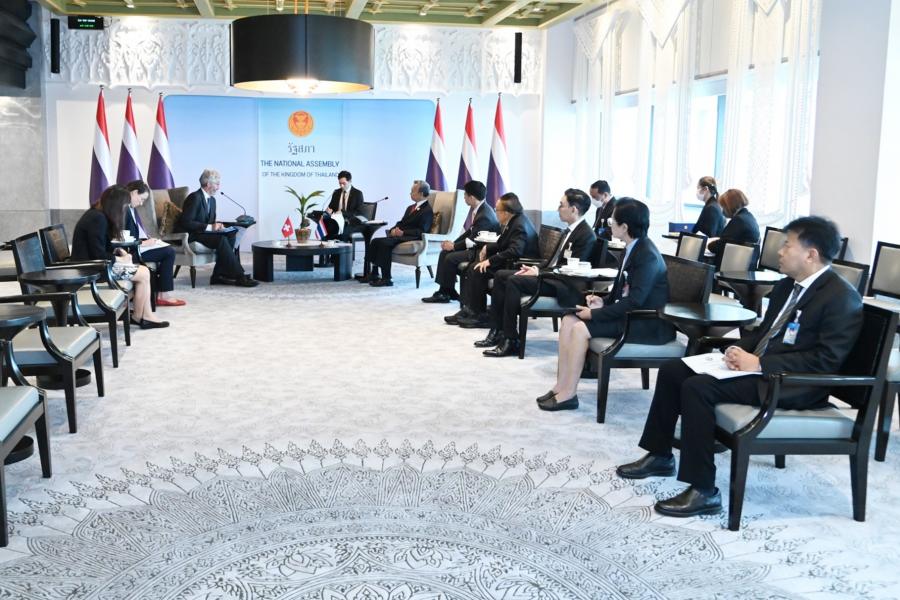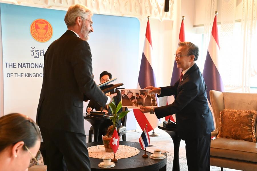 ประธานรัฐสภา กล่าวต้อนรับและชื่นชมเอกอัครราชทูตฯ ที่ได้ปฏิบัติติหน้าที่มาแล้วในหลายประเทศจนกระทั่งปัจจุบันที่มาประจำที่ประเทศไทย โดยเมื่อครั้งดำรงตำแหน่งนายกรัฐมนตรีในปี 2540 เคยได้ให้การต้อนรับนาย Arnold Koller นายกรัฐมนตรีสวิสที่เดินทางมาเยือนไทย รวมทั้งได้พบปะหารือกับนาย Flavio Cotti ประธานาธิบดีสวิสเมื่อครั้งเดินทางไปประชุม World Economic Forum ณ สมาพันธรัฐสวิส เมื่อปี 2541 นอกจากนี้ ยังได้ให้การรับรองนาย Alex Kuprecht ประธานวุฒิสภาที่เดินทางมาเยือนไทยอย่างเป็นทางการในปี 2564 โดยขอฝากความระลึกถึงทุกท่านผ่านทางเอกอัครราชทูตฯ มา ณ โอกาสนี้ สำหรับความสัมพันธ์ระหว่างไทยและสวิสดำเนินไปด้วยดีโดยเฉพาะในระดับพระราชวงศ์ของไทย ซึ่งในหลวงรัชการที่ 5 ได้เคยเสด็จประพาสยุโรปและได้เยือนสวิสเป็นประเทศแรก นอกจากนี้ ในหลวงรัชกาลที่ 9 ทรงประทับและศึกษาอยู่ในสวิสเป็นเวลานาน ซึ่งเป็นเรื่องประวัติศาสตร์ที่ชาวไทยทุกคนจดจำ อันแสดงให้เห็นถึงความใกล้ชิดของทั้งสองประเทศจนถึงทุกวันนี้ ในด้านนิติบัญญัติ ประธานรัฐสภาได้เห็นชอบให้มีการจัดตั้งกลุ่มมิตรภาพสมาชิกรัฐสภาไทย-สวิตเซอร์แลนด์ โดยหวังว่าจะเป็นกลไกความร่วมมือเพื่อแลกเปลี่ยนความสัมพันธ์ในระดับสมาชิกรัฐสภา ทั้งนี้ รัฐสภาไทยมีความพร้อมและยินดีที่จะให้ความร่วมมือในการส่งเสริมความสัมพันธ์ระหว่างไทยและสวิสในทุกโอกาส ในด้านการศึกษา ประธานรัฐสภาเมื่อครั้งดำรงตำแหน่งนายกรัฐมนตรี ได้เป็นผู้ริเริ่มจัดตั้งกองทุนกู้ยืมเพื่อการศึกษา เพื่อเป็นการให้โอกาสทางการศึกษาแก่ผู้ขาดแคลนทุนทรัพย์ พร้อมกันนี้ ประธานรัฐสภาได้สอบถามความคิดเห็นเอกอัครราชทูตฯ กรณีความขัดแย้งระหว่างรัสเซียและยูเครน