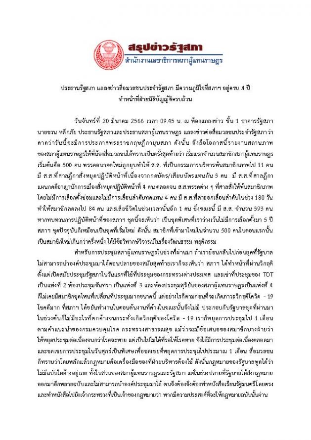 วันจันทร์ที่ 20 มีนาคม 2566 เวลา 09.45 นาฬิกา ณ ห้องแถลงข่าว ชั้น 1 อาคารรัฐสภา นายชวน หลีกภัย ประธานรัฐสภาและประธานสภาผู้แทนราษฎร แถลงข่าวต่อสื่อมวลชนมีความภูมิใจที่สภาฯ อยู่มาครบ 4 ปี ทำหน้าที่ฝ่ายนิติบัญญัติครบถ้วน