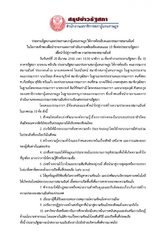 ประธานรัฐสภา ให้การต้อนรับคณะกรรมการสมานฉันท์ ในโอกาสเข้าพบเพื่อนำรายงานผลการดำเนินงานพร้อมข้อเสนอแนะ 10 ข้อ ต่อประธานรัฐสภา เพื่อนำไปสู่การสร้างความปรองดองสมานฉันท์