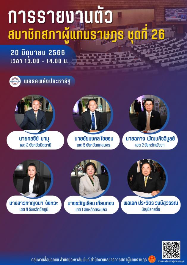 วันอังคารที่ 20 มิถุนายน 2566 ณ ชั้น B1 อาคารรัฐสภา ซึ่งเป็นวันแรกของการรับรายงานตัวสมาชิกสภาผู้แทนราษฎร ชุดที่ 26 ระหว่างเวลา 13.00 – 14.00 นาฬิกา มีสมาชิกสภาผู้แทนราษฎรมารายงานตัว จำนวน 6 คน คือ