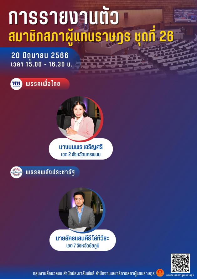 วันอังคารที่ 20 มิถุนายน 2566 ณ ชั้น B1 อาคารรัฐสภา ซึ่งเป็นวันแรกของการรับรายงานตัวสมาชิกสภาผู้แทนราษฎร ชุดที่ 26 ระหว่างเวลา 15.00 - 16.30 นาฬิกา มีสมาชิกสภาผู้แทนราษฎรมารายงานตัว จำนวน 2 คน คือ