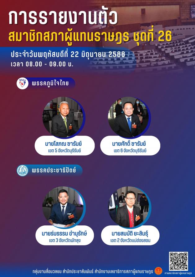 วันพฤหัสบดีที่ 22 มิถุนายน 2566 ซึ่งเป็นวันที่สามของการรับรายงานตัวสมาชิกสภาผู้แทนราษฎร ชุดที่ 26 ระหว่างเวลา 08.00 – 09.00 นาฬิกา ณ ชั้น B1 อาคารรัฐสภา มีสมาชิกสภาผู้แทนราษฎรมารายงานตัวจำนวน 9 คน คือ