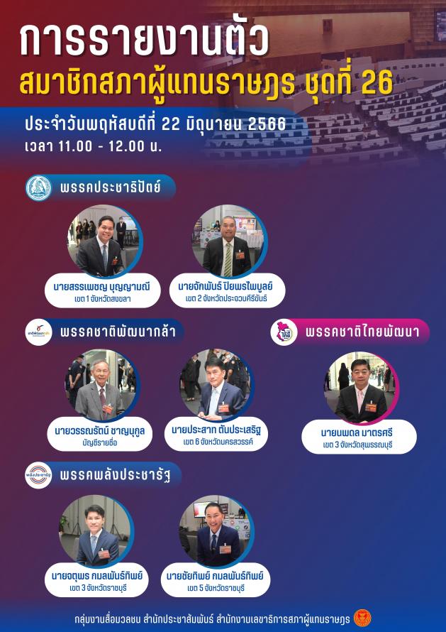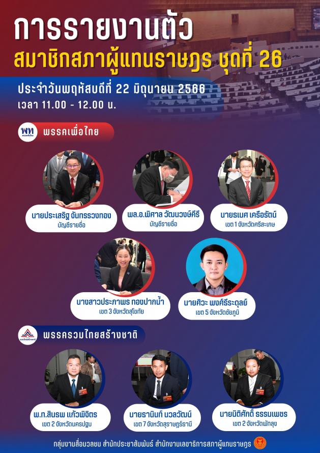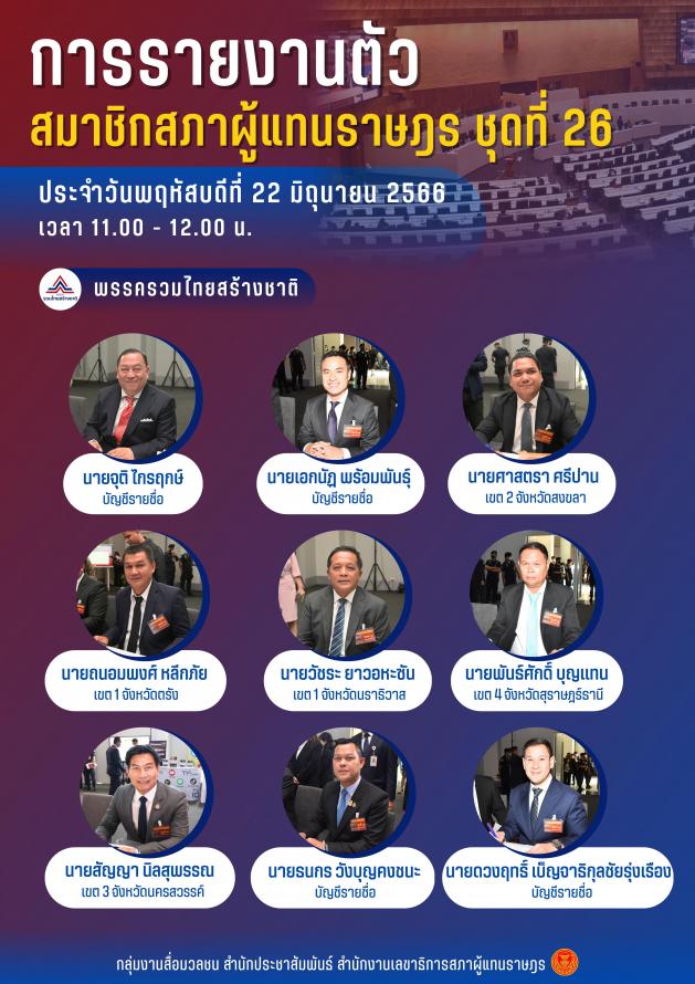 | วันพฤหัสบดีที่ 22 มิถุนายน 2566 ซึ่งเป็นวันที่สามของการรับรายงานตัวสมาชิกสภาผู้แทนราษฎร ชุดที่ 26 ระหว่างเวลา 11.00 12.00 นาฬิกา มีสมาชิกสภาผู้แทนราษฎรมารายงานตัวจำนวน 24 คน คือ อาทิ นายจุติ ไกรฤกษ์ และ ส.ส. พรรครวมไทยสร้างชาติ นายวรรณรัตน์ ชาญนุกูล ส.ส.พรรคชาติพัฒนากล้า
