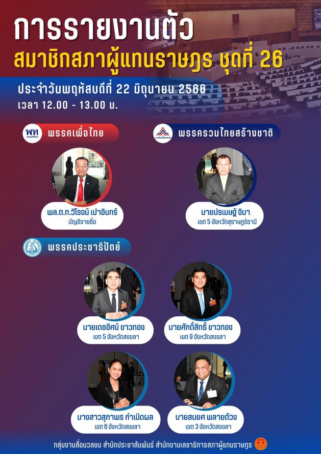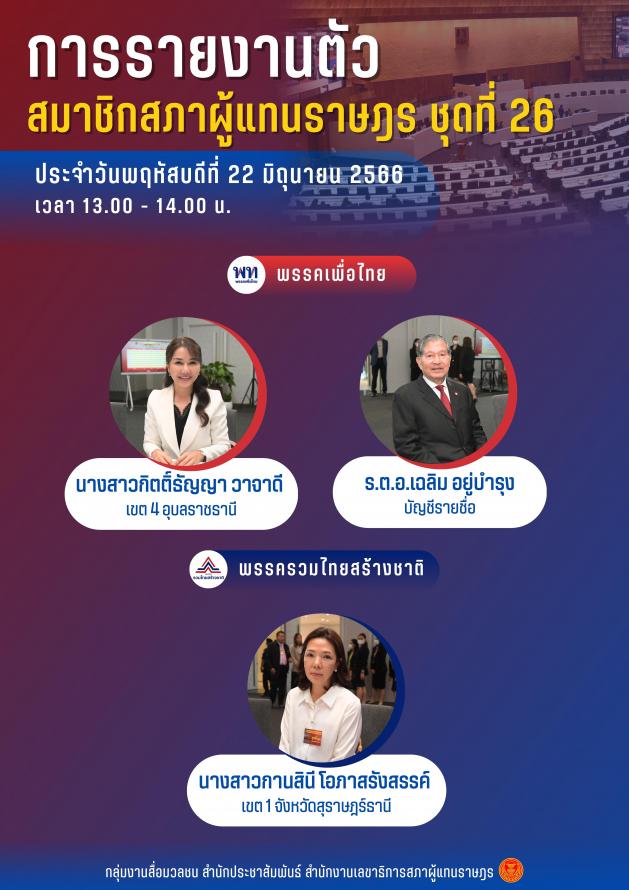 วันพฤหัสบดีที่ 22 มิถุนายน 2566 เวลา 12.00 – 14.00 นาฬิกา ซึ่งเป็นวันที่สามของการรายงานตัว ส.ส.ชุดที่ 26 มี ส.ส. มารายงานตัว 9 คน คือ