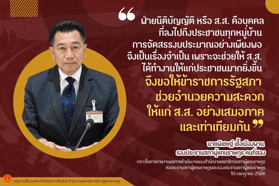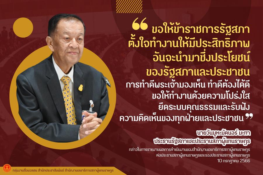 วันจันทร์ที่ 10 กรกฎาคม 2566 เวลา 10.00 นาฬิกา ณ ห้องประชุม CB 406 ชั้น 4 อาคารรัฐสภา นายวันมูหะมัดนอร์ มะทา ประธานสภาผู้แทนราษฎร พร้อมด้วยนายปดิพัทธ์ สันติภาดา รองประธานสภาผู้แทนราษฎร คนที่หนึ่ง และนายพิเชษฐ์ เชื้อเมืองพาน รองประธานสภาผู้แทนราษฎร คนที่สอง เข้าร่วมรับฟังการรายงานผลการดำเนินงานของสำนักงานเลขาธิการสภาผู้แทนราษฎร