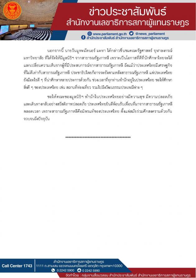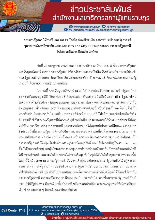 ประธานรัฐสภา ให้การรับรอง อาจารย์ประจำคณะรัฐศาสตร์ จุฬาลงกรณ์มหาวิทยาลัย และคณะองค์กร The May 18Foundation สาธารณรัฐเกาหลี ในโอกาสเดินทางเยือนประเทศไทย