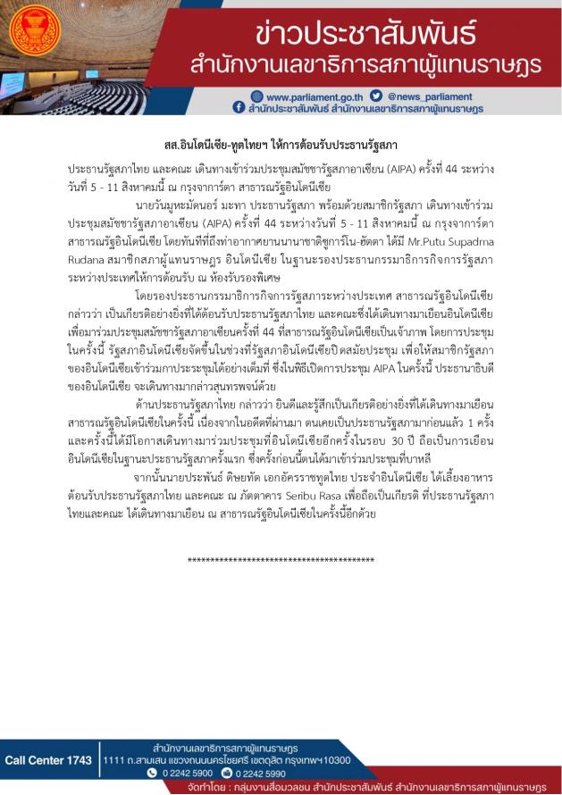 ประธานรัฐสภาไทย และคณะ เดินทางเข้าร่วมประชุมสมัชชารัฐสภาอาเซียน (AIPA) ครั้งที่ 44 ระหว่างวันที่ 5 – 11 สิงหาคมนี้ ณ กรุงจาการ์ตาสาธารณรัฐอินโดนีเซีย