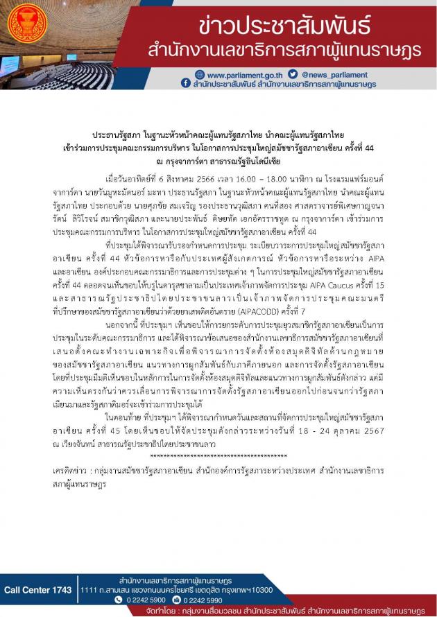 ประธานรัฐสภา ในฐานะหัวหน้าคณะผู้แทนรัฐสภาไทย นำคณะผู้แทนรัฐสภาไทยเข้าร่วมการประชุมคณะกรรมการบริหาร ในโอกาสการประชุมใหญ่สมัชชารัฐสภาอาเซียน ครั้งที่ 44 ณ กรุงจาการ์ตา สาธารณรัฐอินโดนีเซีย