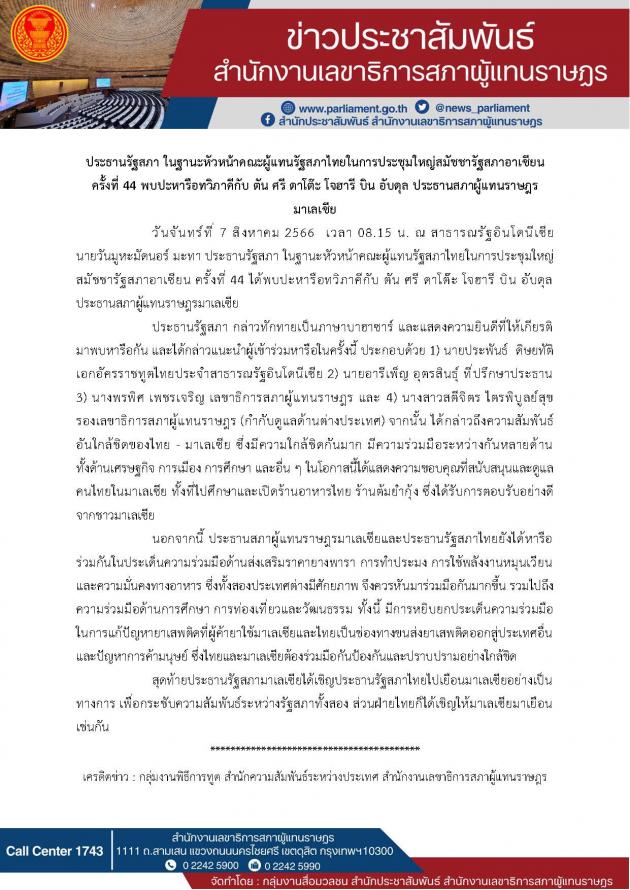 วันจันทร์ที่ 7 สิงหาคม 2566 เวลา 08.15 นาฬิกา ณ สาธารณรัฐอินโดนีเซีย นายวันมูหะมัดนอร์ มะทา ประธานรัฐสภา ในฐานะหัวหน้าคณะผู้แทนรัฐสภาไทยในการประชุมใหญ่สมัชชารัฐสภาอาเซียน ครั้งที่ 44 พบปะหารือทวิภาคีกับ ตัน ศรี ดาโต๊ะ โจฮารี บิน อับดุล ประธานสภาผู้แทนราษฎรมาเลเซีย