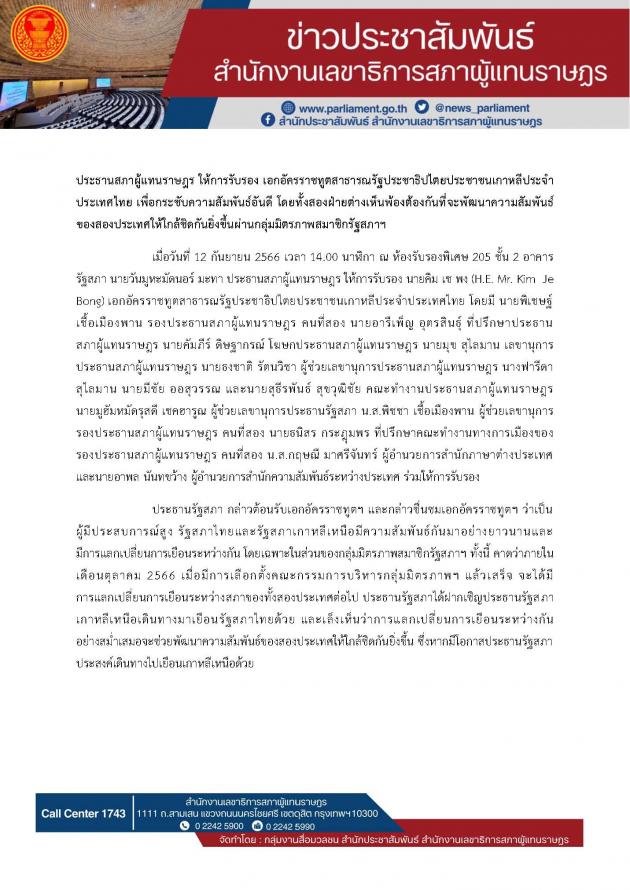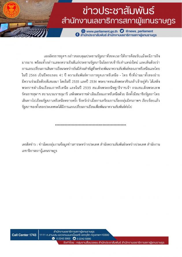 ประธานสภาผู้แทนราษฎร ให้การรับรอง เอกอัครราชทูตสาธารณรัฐประชาธิปไตยประชาชนเกาหลีประจำประเทศไทย เพื่อกระชับความสัมพันธ์อันดี โดยทั้งสองฝ่ายต่างเห็นพ้องต้องกันที่จะพัฒนาความสัมพันธ์ของสองประเทศให้ใกล้ชิดกันยิ่งขึ้นผ่านกลุ่มมิตรภาพสมาชิกรัฐสภาฯ