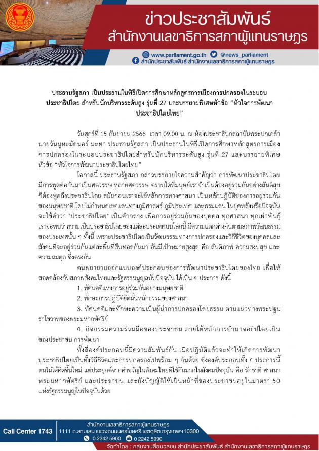 ประธานรัฐสภา เป็นประธานในพิธีเปิดการศึกษาหลักสูตรการเมืองการปกครองในระบอบประชาธิปไตย สำหรับนักบริหารระดับสูง รุ่นที่ 27 และบรรยายพิเศษหัวข้อ “หัวใจการพัฒนาประชาธิปไตยไทย” ณ ห้องประชาธิปก สถาบันพระปกเกล้า