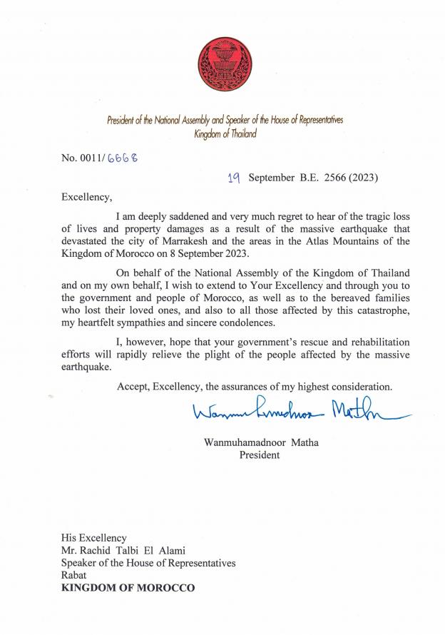 ในนามของรัฐสภาแห่งราชอาณาจักรไทย และในนามของข้าพเจ้า ข้าพเจ้าขอแสดงความเสียใจอย่างสุดซึ้งมายังท่านประธานสภาผู้แทนราษฎรราชอาณาจักรโมร็อกโก และผ่านไปยังรัฐบาล พร้อมด้วยประชาชนชาวโมร็อกโก ตลอดจนครอบครัวของผู้วายชนม์ที่ต้องสูญเสียบุคคลอันเป็นที่รัก รวมถึงผู้ที่ได้รับผลกระทบจากภัยพิบัติในครั้งนี้
