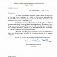 ข้าพเจ้ารู้สึกเสียใจเป็นอย่างยิ่งที่ได้ทราบข่าวการสูญเสียทั้งชีวิตและทรัพย์สินครั้งใหญ่อันเนื่องมาจากเหตุการณ์แผ่นดินไหวอย่างรุนแรงในจังหวัดมาร์ราเกซและบริเวณเทือกเขาแอตลาส ราชอาณาจักรโมร็อกโก เมื่อวันที่ ๘ กันยายน ๒๕๖๖