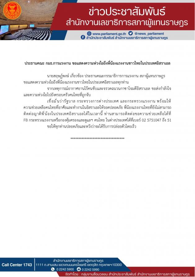ประธานคณะ กมธ. การแรงงาน ขอแสดงความห่วงใยถึงพี่น้องแรงงานชาวไทยในประเทศอิสราเอล
