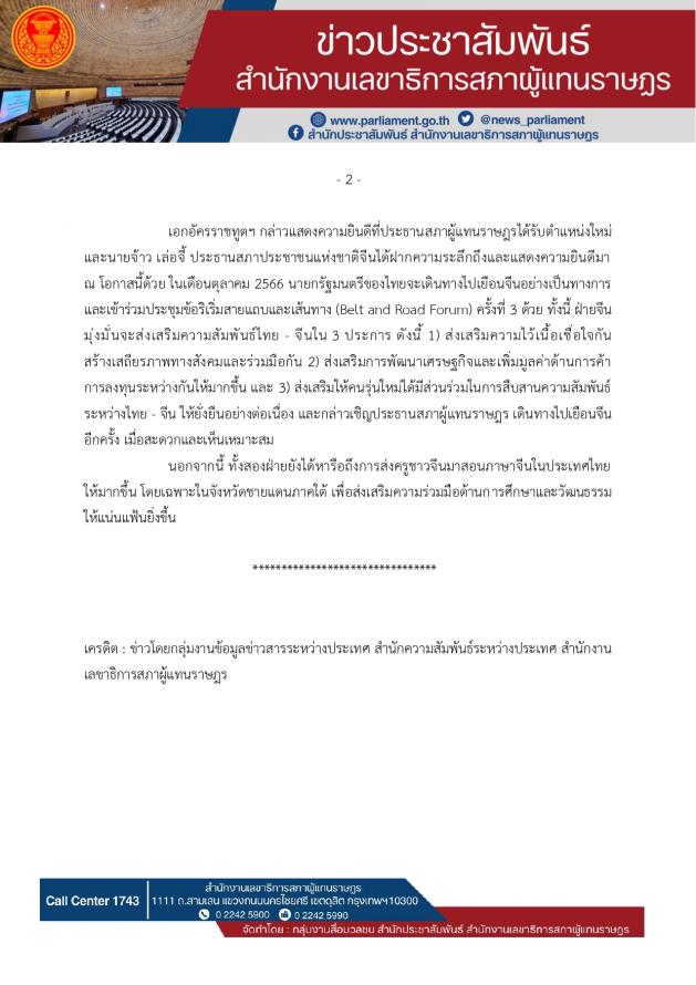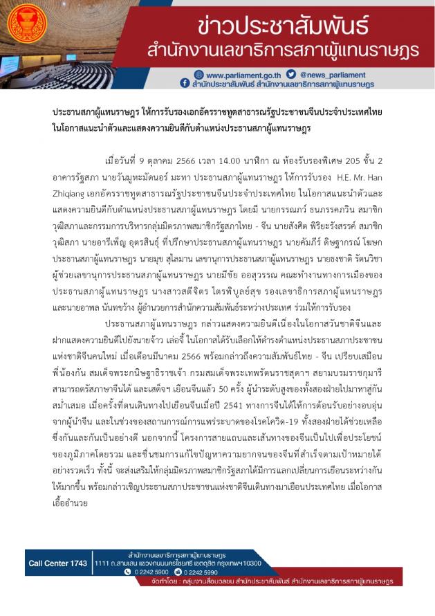 เมื่อวันจันทร์ที่ 9 ตุลาคม 2566 เวลา 14.00 นาฬิกา ณ ห้องรับรองพิเศษ 205 ชั้น 2 อาคารรัฐสภา นายวันมูหะมัดนอร์  มะทา ประธานสภาผู้แทนราษฎร ให้การรับรอง H.E. Mr. Han  Zhiqiang เอกอัครราชทูตสาธารณรัฐประชาชนจีนประจำประเทศไทย ในโอกาสแนะนำตัวและแสดงความยินดีกับตำแหน่งประธานสภาผู้แทนราษฎร โดยมี นายกรรณภว์  ธนภรรคภวิน สมาชิกวุฒิสภาและกรรมการบริหารกลุ่มมิตรภาพสมาชิกรัฐสภาไทย - จีน นายสังศิต พิริยะรังสรรค์ สมาชิกวุฒิสภา พร้อมด้วยข้าราชการรัฐสภาฝ่ายการเมืองคณะทำงานทางการเมืองของประธานสภาผู้แทนราษฎร และผู้บริหารสำนักงานเลขาธิการสภาผู้แทนราษฎรร่วมให้การรับรอง