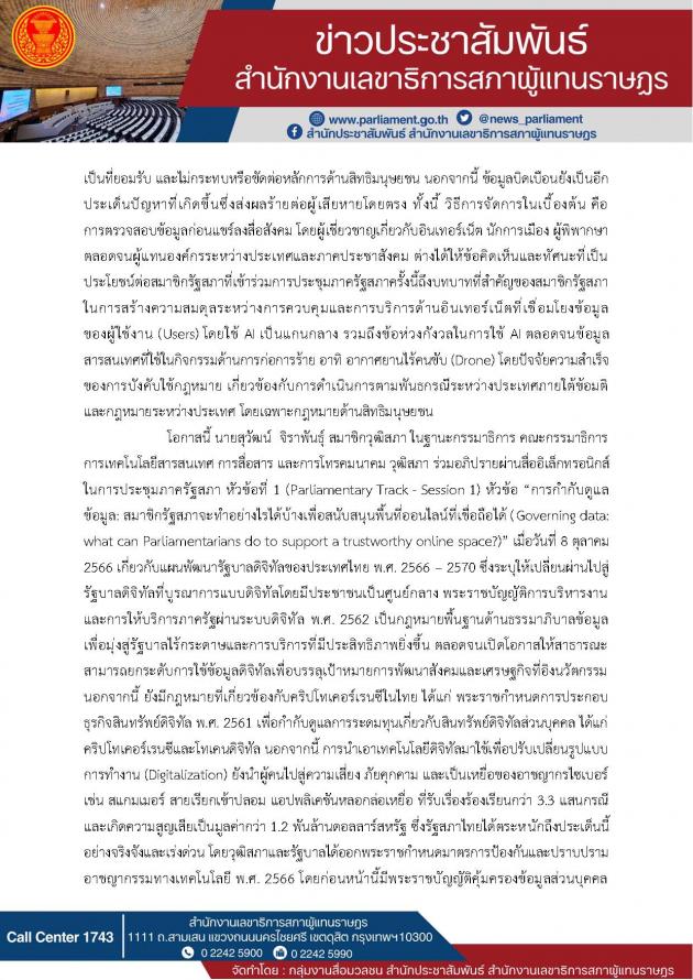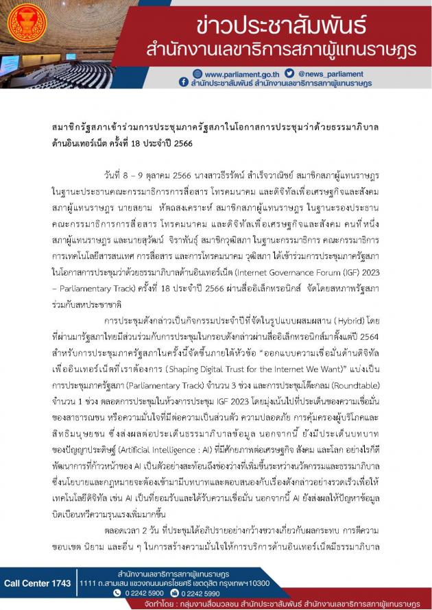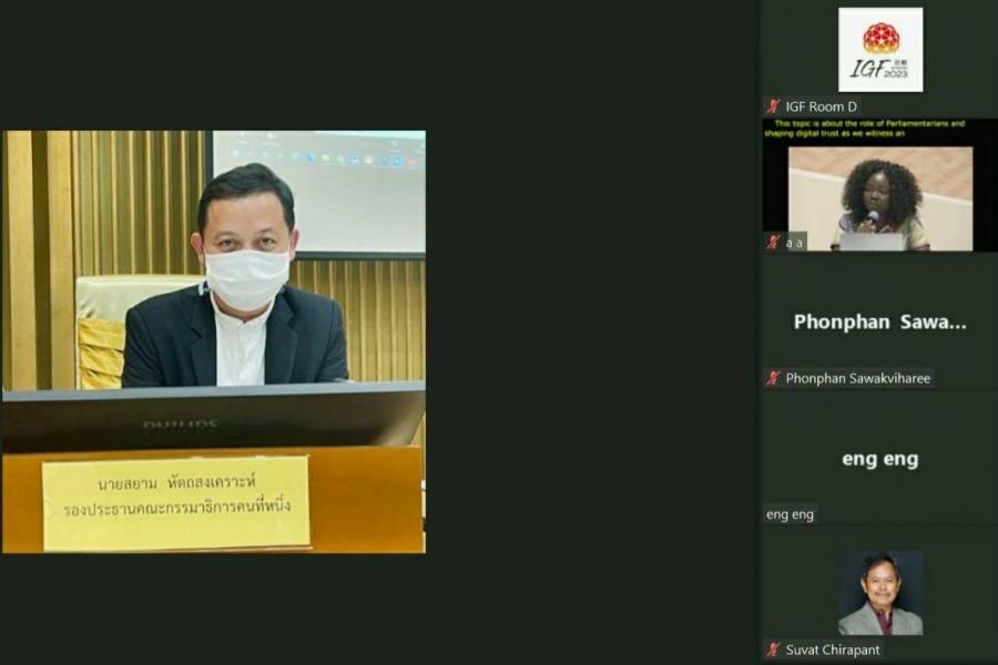 วันที่ 8 9 ต.ค. 66 น.ส.ธีรรัตน์ สำเร็จวาณิชย์ สมาชิกสภาผู้แทนราษฎร ในฐานะประธานคณะกรรมาธิการการสื่อสาร โทรคมนาคม และดิจิทัลเพื่อเศรษฐกิจและสังคม สภาผู้แทนราษฎร นายสยาม หัตถสงเคราะห์ สมาชิกสภาผู้แทนราษฎร ในฐานะรองประธานคณะกรรมาธิการการสื่อสาร โทรคมนาคม และดิจิทัลเพื่อเศรษฐกิจและสังคม คนที่หนึ่ง สภาผู้แทนราษฎร และนายสุวัฒน์ จิราพันธุ์ สมาชิกวุฒิสภา ในฐานะกรรมาธิการ คณะกรรมาธิการการเทคโนโลยีสารสนเทศ การสื่อสาร และการโทรคมนาคม วุฒิสภา ได้เข้าร่วมการประชุมภาครัฐสภาในโอกาสการประชุมว่าด้วยธรรมาภิบาลด้านอินเทอร์เน็ต (Internet Governance Forum (IGF) 2023 Parliamentary Track) ครั้งที่ 18 ประจำปี 2566 ผ่านสื่ออิเล็กทรอนิกส์ จัดโดยสหภาพรัฐสภาร่วมกับสหประชาชาติ