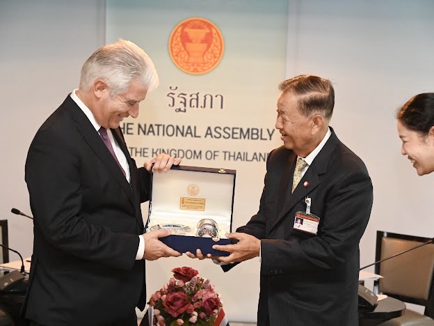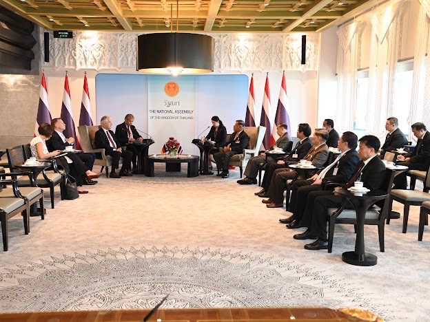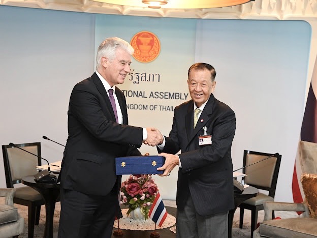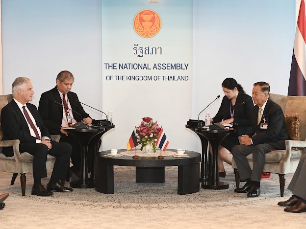 เอกอัครราชทูตสหพันธ์สาธารณรัฐเยอรมนีประจำประเทศไทย กล่าวขอบคุณประธานสภาผู้แทนราษฎรที่ให้การต้อนรับอย่างอบอุ่น พร้อมชื่นชมความสัมพันธ์ระหว่างกันที่มีมาอย่างยาวนาน โดยเอกอัครราชทูตฯ ยินดีที่จะส่งเสริมความสัมพันธ์กับไทยในทุก ๆ ด้าน พร้อมแสดงความยินดีที่ประเทศไทยได้ผ่านพ้นการเลือกตั้งจนสามารถจัดตั้งรัฐบาลและรัฐสภา ซึ่งเป็นไปด้วยดี ปัจจุบันเยอรมนีได้เข้ามาลงทุนในไทยเป็นจำนวนมาก ทั้งนี้ รัฐบาลเยอรมนีได้มีนโยบายกระจายฐานการผลิตออกไปยังภูมิภาคต่าง ๆ เพื่อลดความเสี่ยงจากการพึ่งพาประเทศใดประเทศหนึ่งมากเกินไป ซึ่งเยอรมนีได้บทเรียนมาจากการพึ่งพาพลังงานจากรัสเซียเป็นหลัก จนได้รับผลกระทบเมื่อเกิดความขัดแย้งระหว่างรัสเซียกับยูเครน