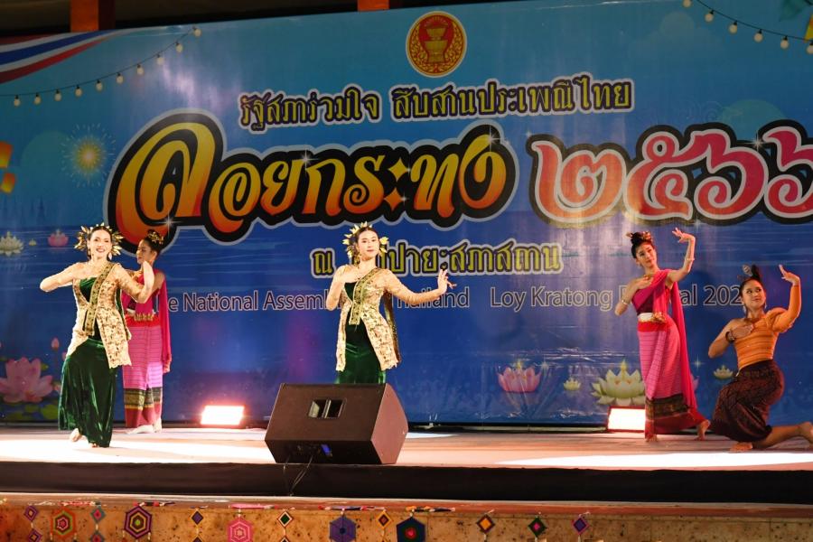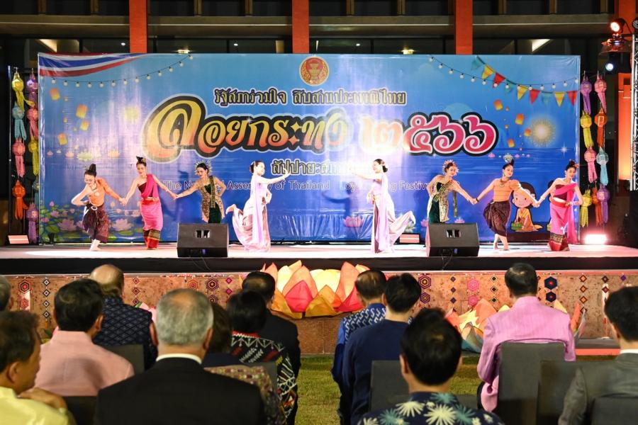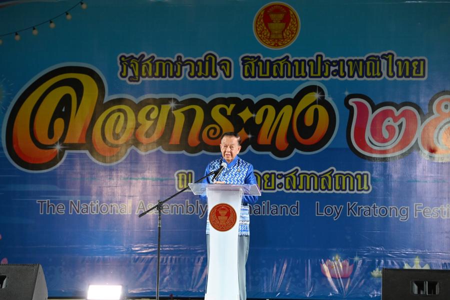 โอกาสนี้ ประธานรัฐสภา กล่าวว่า ในปีนี้นับเป็นการจัดงานต่อเนื่องเป็นครั้งที่สามของรัฐสภา ณ สัปปายะสภาสถานแห่งนี้ ในนามรัฐสภาขอต้อนรับแขกผู้มีเกียรติทุกท่านที่ได้มาร่วมอนุรักษ์ สืบสานและรักษาวัฒนธรรมของไทย ในการให้ความสำคัญต่อสายน้ำ ซึ่งมีความเกี่ยวเนื่องสัมพันธ์กับวิถีชีวิตของคนตั้งแต่ในอดีตจนถึงปัจจุบัน ทั้งเพื่อการอุปโภคบริโภค เป็นวิถีชีวิต เป็นแหล่งอาหาร เป็นศูนย์กลางของชุมชน อีกทั้งเป็นเส้นทางการสัญจรไปมาหาสู่ระหว่างกัน แม้ว่าในทุกวันนี้บทบาทหน้าที่ของแม่น้ำจะลดลงอันเป็นภาพสะท้อนความเปลี่ยนแปลงของยุคสมัย แต่ในอีกมุมหนึ่งสายน้ำยังคงเป็นสัญลักษณ์แห่งความอุดมสมบูรณ์ และบอกเล่าถึงความเป็นมาของผู้คนในอดีต การจัดงานในวันนี้จึงเป็นการสนับสนุนให้เกิดการอนุรักษ์ศิลปวัฒนธรรมในสังคม ควบคู่กับการรักษาขนบธรรมเนียมประเพณี และการดูแลรักษาสิ่งแวดล้อมด้วยจิตสำนึกที่จะสามารถส่งต่อคุณค่าของมรดกทางสังคมและทรัพยากรธรรมชาติที่สำคัญในการดำรงชีวิตให้แก่คนรุ่นต่อไป ตามนโยบายรัฐสภาสีเขียวด้วยการส่งเสริมการใช้วัสดุธรรมชาติ ซึ่งเป็นการนำทรัพยากรที่มีอยู่มาใช้ให้เกิดประโยชน์สูงสุด และเป็นโอกาสที่ได้แสดงถึงการร่วมมือร่วมใจในการจัดกิจกรรมและร่วมกิจกรรมโดยการสวมใส่ชุดผ้าไทยอันแสดงถึงความรักความสามัคคีของบุคลากรในวงงานรัฐสภา นอกจากนี้ นับเป็นโอกาสอันดีที่ รัฐสภาได้รับเกียรติจากเอกอัครราชทูตประจำประเทศไทยกว่า ๑๗ ประเทศ ที่ได้มาร่วมสัมผัสวัฒนธรรมไทย เพื่อให้เกิดการถ่ายทอดและส่งต่อความประทับใจนี้ไปยังนานาประเทศ ซึ่งถือเป็นอีกช่องทางหนึ่งที่จะเชิญชวนนักท่องเที่ยวจากทั่วโลกกลับมาเที่ยวประเทศไทย อันจะช่วยส่งเสริมและยกระดับอุตสาหกรรมการท่องเที่ยวไทยสู่การเติบโตอย่างยั่งยืน เพื่อให้สอดรับกับสภาพแวดล้อมด้านการแข่งขันและความท้าทายด้านเศรษฐกิจ และสังคมที่เพิ่มขึ้นตามการเปลี่ยนแปลงของโลกยุคใหม่