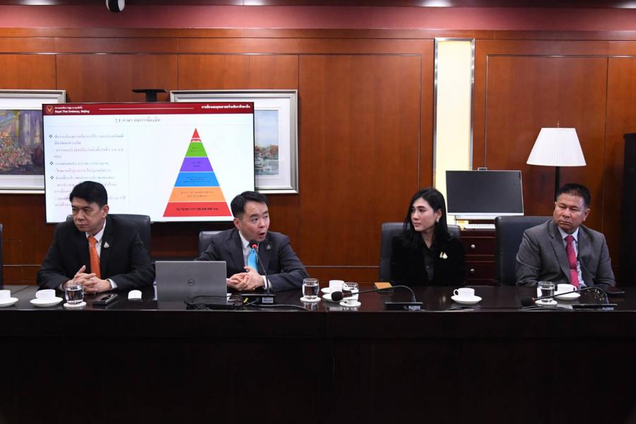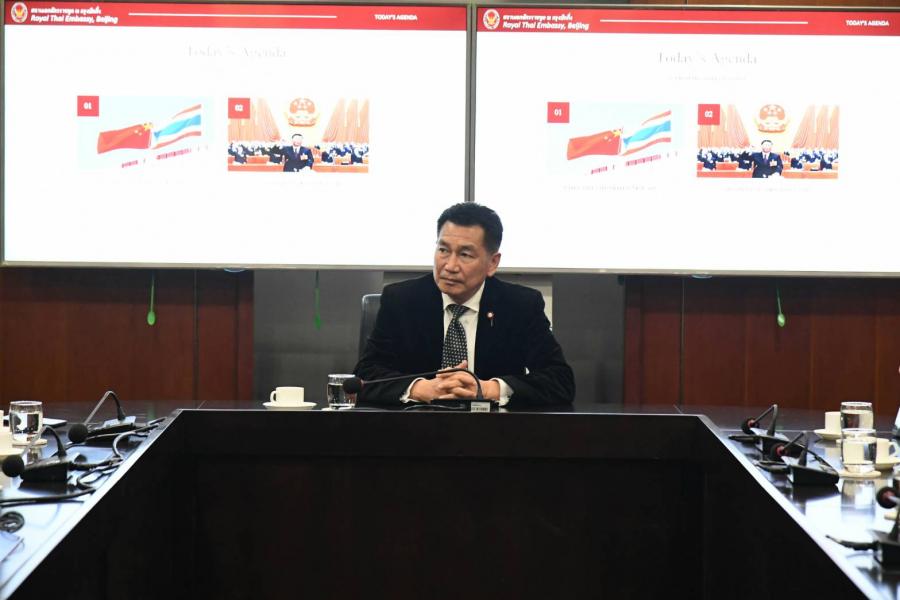 เมื่อวันพุธที่ 6 ธันวาคม 2566 เวลา 18.30 นาฬิกา ณ สถานเอกอัครราชทูตไทย ณ กรุงปักกิ่ง สาธารณรัฐประชาชนจีน นายพิเชษฐ์ เชื้อเมืองพาน รองประธานสภาผู้แทนราษฎร คนที่สอง และคณะ ได้เดินทางถึงสถานเอกอัครราชทูตไทย ณ กรุงปักกิ่ง โดยได้รับฟังการบรรยายสรุปภาพรวมของความสัมพันธ์ไทย-จีน จากนายสิทธิกร ฉันทแดนสุวรรณ อัครราชทูตที่ปรึกษา ดังนี้ 1. (small yellow diamond) ความสัมพันธ์ทางการเมืองไทยกับจีนสถาปนาความสัมพันธ์ทางการทูตเมื่อวันที่ 1 ก.ค. 18 และปี 2566 ครบ 48 ปี ความสัมพันธ์ทางการทูต โดยความสัมพันธ์ของทั้งสองประเทศเป็นไปอย่างราบรื่นและฉันมิตรทุกระดับ รวมถึงหุ้นส่วนความร่วมมือเชิงยุทธศาสตร์อย่างรอบด้านระหว่างไทย-จีน ที่แน่นแฟ้นและมีพลวัต แม้จะประสบกับสถานการณ์ COVID-19 สะท้อนได้จากการหารือแลกเปลี่ยนผู้นำระดับสูงอย่างต่อเนื่อง การให้ความช่วยเหลือซึ่งกันและกันของภาครัฐบาลและประชาชน ทั้งยา เวชภัณฑ์ และการส่งกำลังใจให้กันและกัน ไทยกับจีนมีความร่วมมือด้านความมั่นคงและการป้องกันประเทศในด้านอาวุธยุทโธปกรณ์ การฝึกซ้อมระหว่างเหล่าทัพ