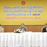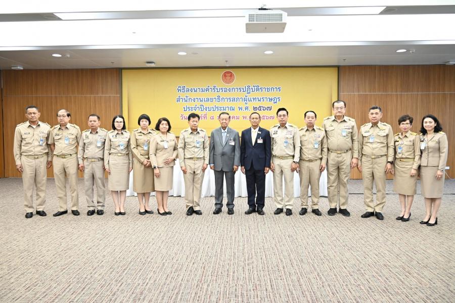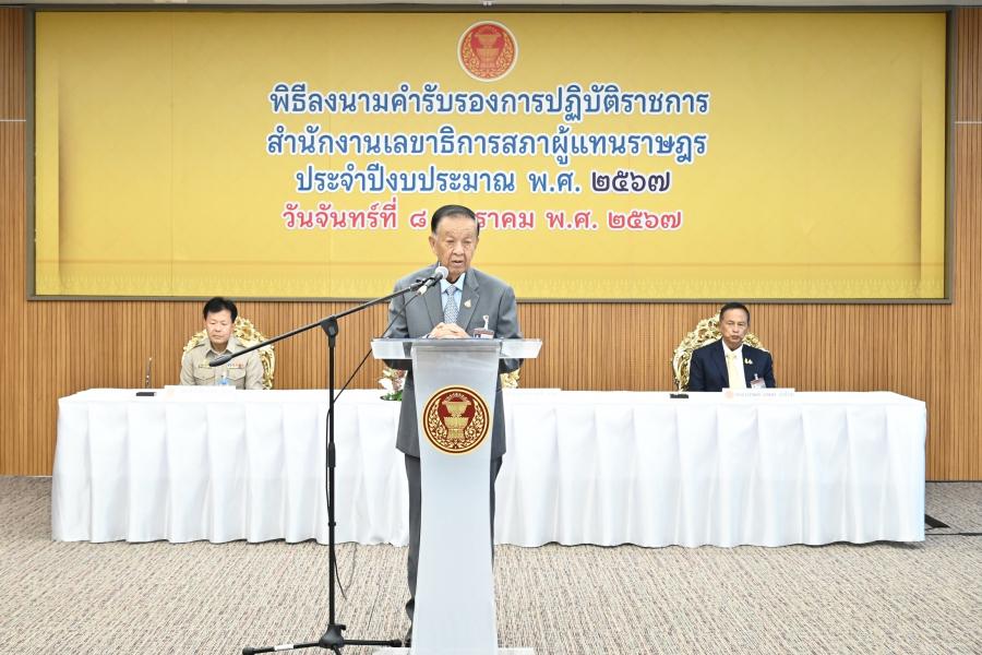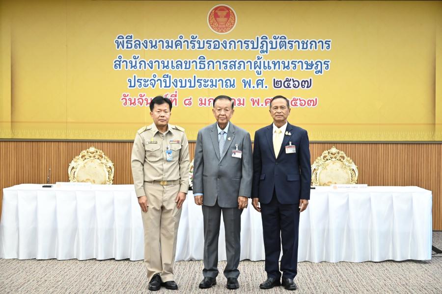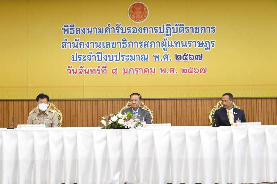 วันจันทร์ที่ 8 มกราคม 2567 เวลา 14.00 นาฬิกา ณ ห้องประชุม 603-605 ชั้น 6 อาคารรัฐสภา นายวันมูหะมัดนอร์ มะทา ประธานสภาผู้แทนราษฎร เป็นประธานในพิธีลงนามคำรับรองการปฏิบัติราชการของสำนักงานเลขาธิการสภาผู้แทนราษฎรประจำปีงบประมาณ พ.ศ. 2567 พร้อมทั้งลงนามคำรับรองการปฏิบัติราชการฯ ร่วมกับ ว่าที่ ร.ต.ต.อาพัทธ์ สุขะนันท์ เลขาธิการสภาผู้แทนราษฎร โดยมี พล.ต.อ.วรพงษ์ ชิวปรีชา ประธาน อ.ก.ร.ประเมินประสิทธิภาพและประสิทธิผลของงานราชการของรัฐสภาเป็นสักขีพยาน