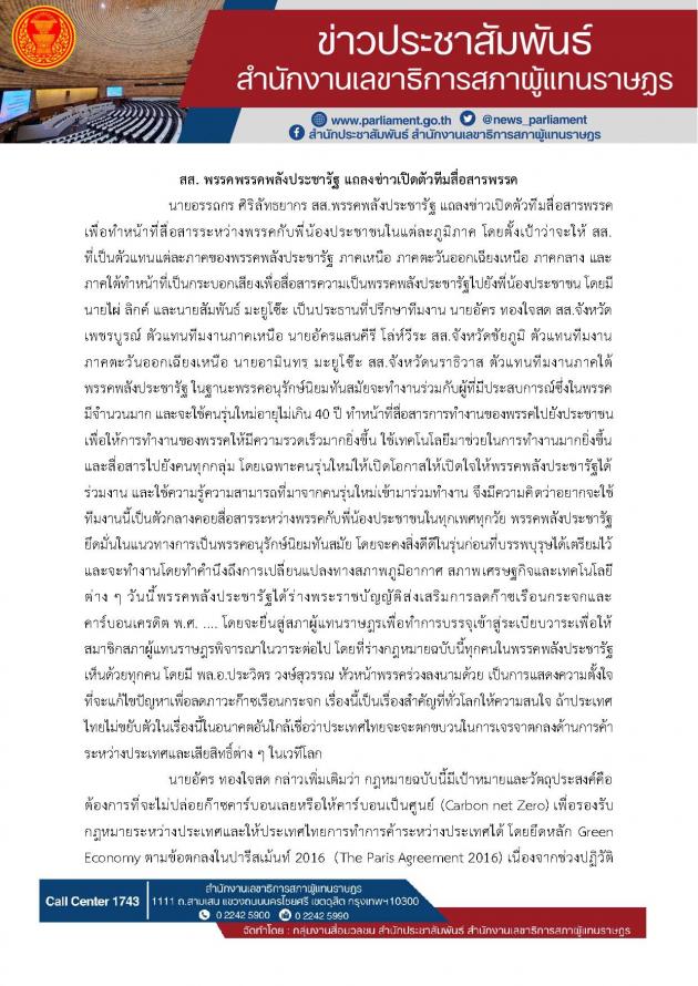 วันพฤหัสบดีที่ 21 มีนาคม 2567 เวลา 13.30 น. ณ ห้องแถลงข่าว ชั้น 1 อาคารรัฐสภา นายอรรถกร ศิริลัทธยากร สส.พรรคพลังประชารัฐ แถลงข่าว เปิดตัวทีมสื่อสารพรรค เพื่อทำหน้าที่สื่อสารระหว่างพรรคกับพี่น้องประชาชนในแต่ละภูมิภาค โดยตั้งเป้าว่าจะให้ สส.ที่เป็นตัวแทนแต่ละภาคของพรรคพลังประชารัฐ ภาคเหนือ ภาคตะวันออกเฉียงเหนือ ภาคกลาง และภาคใต้ ทำหน้าที่เป็นกระบอกเสียงเพื่อสื่อสารความเป็นพรรคพลังประชารัฐไปยังพี่น้องประชาชน