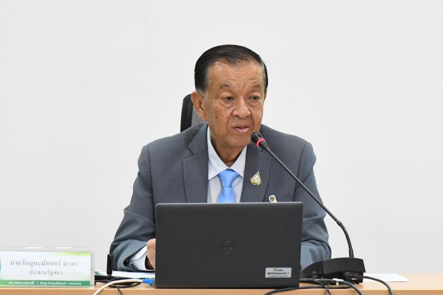 โอกาสนี้ ประธานรัฐสภา กล่าวว่า มีความยินดีและรู้สึกเป็นเกียรติอย่างยิ่งที่ได้มาเป็นประธานในพิธีเปิดการศึกษาอบรมในวันนี้ โดยขอต้อนรับและชื่นชมผู้เข้ารับการศึกษาอบรมทุกท่านที่มีความตั้งใจในการเพิ่มพูนความรู้และทักษะ เพื่อพัฒนางานตามที่ทุกท่านรับผิดชอบ ในฐานะผู้สนับสนุนงานของสมาชิกรัฐสภา นับแต่บัดนี้ ทุกท่านคือนักศึกษาของสถาบันพระปกเกล้า ซึ่งต้องขอขอบคุณคณะกรรมการบริหารหลักสูตรที่ได้มีการทบทวนพัฒนาปรับปรุงหลักสูตรให้สมบูรณ์ และรับกับสถานการณ์ทางการเมือง เศรษฐกิจ และสังคมที่เปลี่ยนแปลงอยู่เสมอ หลักสูตรนี้จะช่วยเสริมสร้างศักยภาพให้กับนักศึกษาทุกท่านที่ได้รับแต่งตั้งจากสมาชิกรัฐสภาให้ทำหน้าที่ผู้เชี่ยวชาญ และผู้ชำนาญการประจำตัวสมาชิกรัฐสภา ได้มีความรู้ความเข้าใจในบทบาทหน้าที่และอำนาจของรัฐสภา และสมาชิกรัฐสภาในด้านต่าง ๆ เพิ่มมากขึ้น ซึ่งจะทำให้นักศึกษาได้เข้าใจในบทบาทหน้าที่ของตนได้ดียิ่งขึ้น หากนักศึกษามีข้อคิดเห็นและข้อเสนอแนะเพื่อนำมาพัฒนาหลักสูตรก็จะเป็นประโยชน์ต่อนักศึกษารุ่นน้องต่อไป ขอให้ใช้เวลาอันมีค่านี้ ตั้งใจศึกษาเล่าเรียน นำความรู้ ทักษะ และประสบการณ์ ที่ได้รับจากวิทยากรผู้ทรงคุณวุฒิ และเพื่อนนักศึกษาร่วมรุ่น ไปประยุกต์ใช้ในการสนับสนุนงานด้านวิชาการ งานด้านนิติบัญญัติ และให้ความช่วยเหลือประชาชนในพื้นที่ได้อย่างสร้างสรรค์ สามารถสนับสนุนภารกิจของสมาชิกรัฐสภาในฐานะตัวแทนของประชาชนได้อย่างมีประสิทธิภาพ และบรรลุประสิทธิผลสูงสุด เป็นไปตามบทบัญญัติของรัฐธรรมนูญ และกฎหมายอื่น ๆ ที่เกี่ยวข้อง ตามวิถีและครรลองของการปกครองระบอบประชาธิปไตยอันมีพระมหากษัตริย์ทรงเป็นประมุข และขอให้การจัดการศึกษาอบรมดำเนินไปด้วยความเรียบร้อยและบรรลุเป้าหมายตามวัตถุประสงค์ทุกประการ
