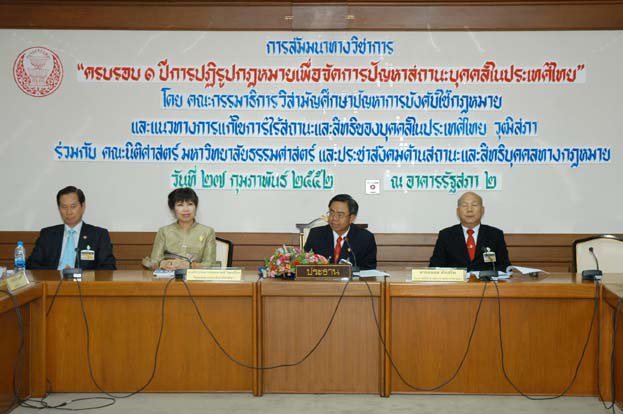 | เมื่อวันศุกร์ที่ ๒๗ กุมภาพันธ์ ๒๕๕๒ เวลา ๐๙.๓๐ นาฬิกา คณะกรรมาธิการวิสามัญศึกษาปัญหาการบังคับใช้กฎหมายและแนวทางแก้ไขการไร้สถานะและสิทธิของบุคคลในประเทศไทย วุฒิสภา โดยนายตวง อันทะไชย ประธานคณะกรรมาธิการฯ ได้จัดการสัมมนาวิชาการเรื่อง ครบรอบหนึ่งปีการปฏิรูปกฎหมายเพื่อจัดการปัญหาสถานะบุคคลในประเทศไทย เพื่อให้ตัวแทนจากทุกภาคส่วน ทั้งที่เป็นเจ้าหน้าที่ของรัฐ เจ้าหน้าที่ขององค์กรพัฒนาเอกชน และบุคคลที่สนใจในการร่วมกันแก้ไขปัญหาการไร้รัฐ ไร้สัญชาติร่วมแลกเปลี่ยนประสบการณ์ทํางานตามพระราชบัญญัติการทะเบียนราษฎร และ พระราชบัญญัติสัญชาติ รวมทั้งร่วมกันหาแนวทางแก้ไขปัญหาที่เกิดขึ้นอันจะเป็นอุปสรรคต่อการแก้ไขปีญหาสถานะบุคคลของคนไร้รัฐไร้สัญชาติในประเทศไทยต่อไป ณ ห้องรับรอง ๑-๒ ชั้น ๓ อาคารรัฐสภา ๒ |