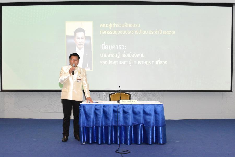 วันพุธที่ 24 เมษายน 2567 เวลา 10.00 นาฬิกา ณ ห้องประชุมสัมมนา B1-2 ชั้น B 1 อาคารรัฐสภา  นายพิเชษฐ์ เชื้อเมืองพาน  รองประธานสภาผู้แทนราษฎร คนที่สอง ให้การต้อนรับพร้อมกล่าวให้โอวาทกับยุวชนประชาธิปไตยประจำปีงบประมาณ พ.ศ. 2567 ใจความตอนหนึ่งว่า ยุวชนประชาธิปไตยคืออนาคตของประเทศ การจัดฝึกอบรมในครั้งนี้ยุวชนจะได้เรียนรู้เพิ่มพูนประสบการณ์ รวมถึงมีโอกาสเข้ามามีส่วนร่วมในกิจกรรมต่าง ๆ เพื่อจะได้นำความรู้ ความเข้าใจและประสบการณ์ที่ได้รับไปพัฒนาประชาธิปไตย พร้อมทั้งเล่าประสบการณ์ของชีวิตในการก้าวสู่สนามการเมือง จะต้องมีองค์ความรู้ อาชีพ  ครอบครัวที่อบอุ่น จึงเดินเข้าสู่การเมืองได้  การตัดสินใจรับใช้พี่น้องประชาชน  อันเนื่องมาจากรัฐธรรมนูญแห่งราชอาณาจักรไทย พุทธศักราช 2540 ที่ถูกขนานนามว่าเป็นรัฐธรรมนูญฉบับประชาชน เนื่องมาจากเป็นรัฐธรรมนูญที่มีส่วนร่วมจากประชาชนมากที่สุด ประชาชนมีความตื่นตัวเกี่ยวกับบ้านเมืองเป็นอย่างมาก ท้ายนี้ ขอให้ยุวชนประชาธิปไตย เป็นกำลังสำคัญในการพัฒนาประเทศชาติและสังคมให้เจริญก้าวหน้าต่อไป