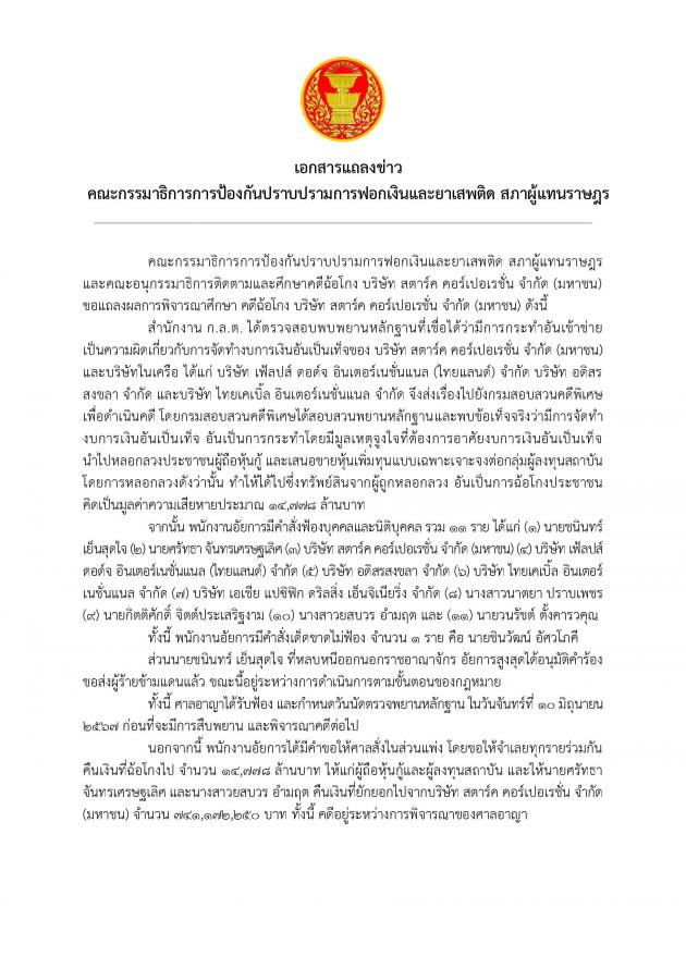 วันพุธที่ 8 พฤษภาคม 2567 เวลา 13.00 นาฬิกา ณ ห้องแถลงข่าว ชั้น 1 อาคารรัฐสภา นายเลิศศักดิ์ พัฒนชัยกุล ประธาน คณะ กมธ.การป้องกันปราบปรามการฟอกเงินและยาเสพติด พร้อมด้วย พ.ต.อ. สีหนาท ประยูรรัตน์ รองประธานคณะอนุ กมธ.ติดตามและศึกษาคดีฉ้อโกง บริษัท สตาร์ค คอร์เปอเรชั่น จำกัด (มหาชน) คนที่หนึ่ง และคณะ ร่วมกันแถลงผลการพิจารณาศึกษาคดีฉ้อโกง บริษัท สตาร์ค คอร์เปอเรชั่น จำกัด (มหาชน)