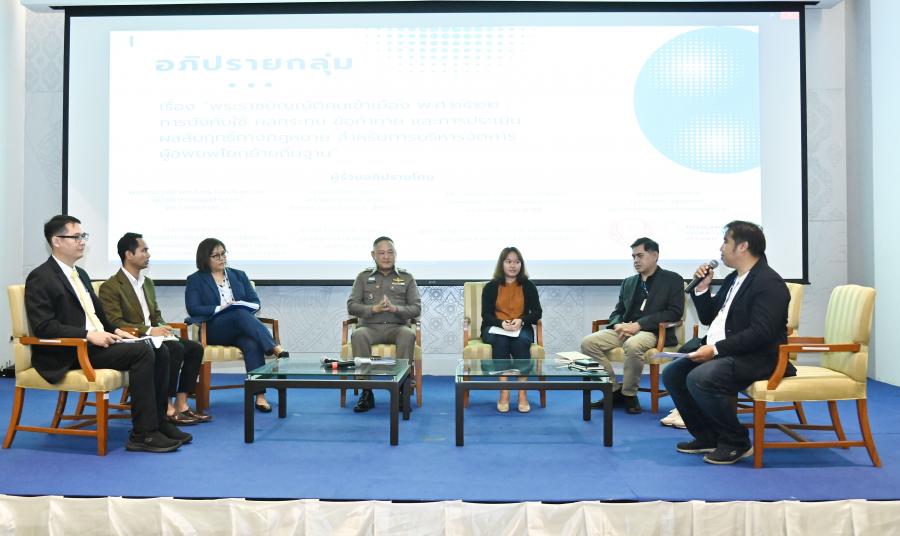 เวลา 10.00 นาฬิกา เป็นการอภิปรายกลุ่ม เรื่อง "พระราชบัญญัติคนเข้าเมือง พ.ศ. 2522 : การบังคับใช้ ผลกระทบ ข้อท้าทาย และการประเมินผลสัมฤทธิ์ทางกฎหมาย สำหรับการบริหารจัดการผู้อพยพโยกย้ายถิ่นฐาน" โดย พล.ต.ต.พงษ์นคร นครสันติภาพ ผู้บังคับการศูนย์ฝึกอบรมตรวจคนเข้าเมือง นายทรงกลด ขาวแจ้ง ผู้อำนวยการกลุ่มงานประสานนโยบายผู้อพยพและหลบหนีเข้าเมือง กองการต่างประเทศ สำนักปลัดกระทรวงมหาดไทย กระทรวงมหาดไทย นายศิววงศ์ สุขทวี ผู้แทนเครือข่ายองค์กรด้านประชากรข้ามชาติ (MWG) น.ส.วริศรา รุ่งทอง ผู้แทนเครือข่ายสิทธิผู้ลี้ภัยและคนไร้รัฐ (CRSP) Ms.Joanna Francesca Dabao ผู้แทนองค์การระหว่างประเทศเพื่อการโยกย้ายถิ่นฐาน (IOM) ผศ.ดร.ดารุณี ไพศาลพานิชย์กุล คณะนิติศาสตร์ มหาวิทยาลัยเชียงใหม่ ดำเนินรายการโดย นายอดิศร เกิดมงคล ผู้แทนเครือข่ายปฏิรูปการโยกย้ายถิ่นฐาน