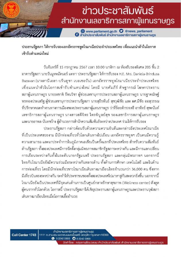ประธานรัฐสภา กล่าวต้อนรับด้วยความความยินดีและกล่าวถึงประเทศโรมาเนียที่เป็นประเทศสวยงาม มีนักท่องเที่ยวทั่วโลกเดินทางไปเยือน เอกอัครราชทูตฯ