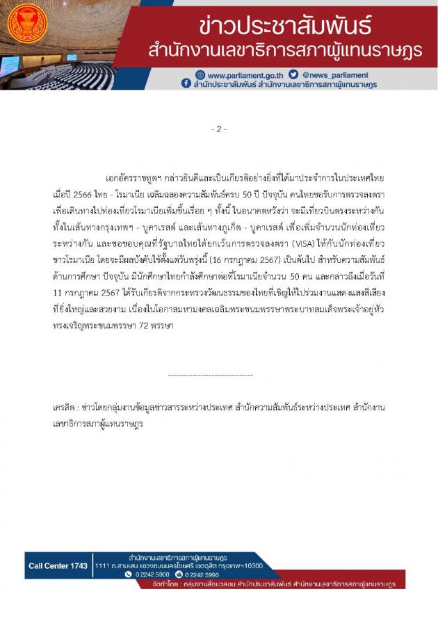 ระหว่างกัน และขอขอบคุณที่รัฐบาลไทยได้ยกเว้นการตรวจลงตรา (VISA) ให้กับนักท่องเที่ยวชาวโรมาเนีย โดยจะมีผลบังคับใช้ตั้งแต่วันพรุ่งนี้ (16 กรกฎาคม 2567) เป็นต้นไป
