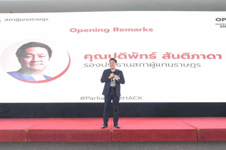 | วันอังคารที่ 6 สิงหาคม 2567 เวลา 09.30 นาฬิกา ณ ห้องโถง ชั้น B1 อาคารรัฐสภา นายปดิพัทธ์ สันติภาดา รองประธานสภาผู้แทนราษฎร คนที่หนึ่ง ในฐานะประธานคณะกรรมการเทคโนโลยีสารสนเทศและการสื่อสารของรัฐสภา เป็นประธานในพิธีเปิดโครงการสัมมนาเพื่อระดมความคิดสร้างสรรค์และพัฒนานวัตกรรมเพื่อข้อมูลเปิดของรัฐสภา ในหัวข้อ OPEN Parliament Hackathon 2024 โดยมี ผู้บริหารสำนักงานเลขาธิการสภาผู้แทนราษฎรและสำนักงานเลขาธิการวุฒิสภา บุคลากรทั้งสองสำนักงานฯ เจ้าหน้าที่ผู้ปฏิบัติงาน และประชาชนทั่วไป เข้าร่วมโครงการมากกว่า 300 คน