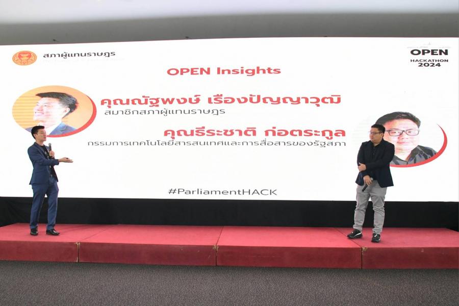 ต่อจากนั้น นายณัฐพงษ์ เรืองปัญญาวุฒิ สมาชิกสภาผู้แทนราษฎร ในฐานะกรรมการเทคโนโลยีสารสนเทศและการสื่อสารของรัฐสภา และนายธีระชาติ ก่อตระกูล กรรมการฯ ร่วมเสวนาในหัวข้อ Exclusive Talk : มุมมองการเปลี่ยนประเทศจากการประยุกต์ใช้เทคโนโลยีของรัฐสภาโครงการดังกล่าวจัดโดยสำนักสารสนเทศ มีวัตถุประสงค์เพื่อเผยแพร่ และส่งเสริมความรู้ ความเข้าใจในกระบวนการนิติบัญญัติ และภารกิจหลักของรัฐสภา และเปิดโอกาสให้ผู้เข้าร่วมโครงการได้แสดงความคิดเห็นและสะท้อนปัญหาและอุปสรรคในกระบวนการนิติบัญญัติของรัฐสภา เพื่อนำข้อคิดเห็นและข้อเสนอแนะที่ได้มาพัฒนาการปฏิบัติงานในกระบวนการนิติบัญญัติของรัฐสภา อีกทั้งเปิดโอกาสให้ประชาชนได้เข้ามามีส่วนร่วม และระดมความคิดสร้างสรรค์ในการออกแบบแพลตฟอร์มเพื่อข้อมูลเปิดของรัฐสภาโดยใช้เทคโนโลยีในยุคปัญญาประดิษฐ์ ซึ่งได้จัดกิจกรรมสัมมนาระดมความคิดสร้างสรรค์และพัฒนานวัตกรรมเพื่อข้อมูลเปิดของรัฐสภา โดยใช้เทคโนโลยีในยุคปัญญาประดิษฐ์ ภายใต้หัวข้อ OPEN Parliament Hackathon 2024 โดย ศูนย์เทคโนโลยีอิเล็กทรอนิกส์และคอมพิวเตอร์แห่งชาติ (NECTEC) สมาคมผู้ประกอบการเทคโนโลยีดิจิทัล และสมาคมปัญญาประดิษฐ์ประเทศไทย (AiAT) รวมทั้งกิจกรรมกลุ่มระดมความคิดเพื่อออกแบบแพลตฟอร์มเพื่อข้อมูลเปิดของรัฐสภาโดยใช้เทคโนโลยีในยุคปัญญาประดิษฐ์ ภายใต้หัวข้อ OPEN Parliament Hackathon 2024 โดย สำนักงานเลขาธิการสภาผู้แทนราษฎร ศูนย์เทคโนโลยีอิเล็กทรอนิกส์และคอมพิวเตอร์แห่งชาติ (NECTEC) สมาคมผู้ประกอบการเทคโนโลยีดิจิทัล และสมาคมปัญญาประดิษฐ์ประเทศไทย (AiAT) ซึ่งจัดโครงการฯ ระหว่างวันที่ 6 - 7 ส.ค. 67