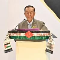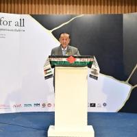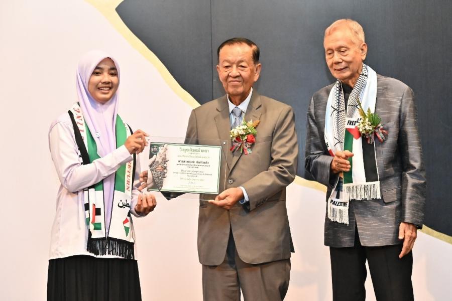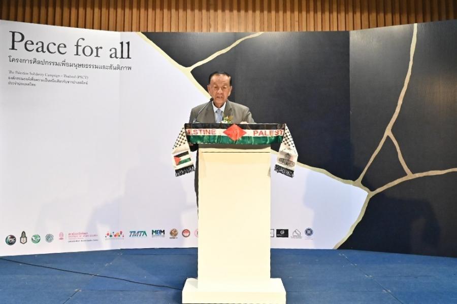 โอกาสนี้ นายวันมูหะมัดนอร์ มะทา กล่าวเปิดงานใจความตอนหนึ่งว่า รู้สึกยินดีและเป็นเกียรติอย่างยิ่ง ที่ได้มาเป็นประธานเปิดงานแสดงศิลปกรรมเพื่อมนุษยธรรมและสันติภาพ Peace for all ซึ่งองค์กร PSC ประเทศไทยร่วมกับองค์กรพันธมิตร ได้ร่วมกันจัดขึ้นในวันนี้ ขอแสดงความชื่นชมท่านทั้งหลายที่ได้ให้ความสำคัญ ในการแสดงเจตนารมณ์ร่วมกัน จัดกิจกรรมที่แสดงออกให้สังคมได้รับรู้ และตระหนักในพลังของการผลักดันให้เกิดสันติภาพ โดยมีเป้าหมายสูงสุดเพื่ออุทิศให้แก่ การเรียกร้องสันติภาพสำหรับชาวกาซ่า ชาวราฟาห์ และชาวโลกทั้งมวล ผ่านการจัดงานในวันนี้ ตนขอขอบคุณ องค์กรรณรงค์เพื่อความเป็นหนึ่งเดียวกับชาวปาเสสไตน์ประจำประเทศไทย และภาคีเครือข่ายทุกท่าน ที่ได้ให้ความร่วมมือร่วมใจ สนับสนุน และช่วยเหลือในการดำเนินงานในวันนี้เกิดขึ้นได้อย่างสมบูรณ์ บัดนี้ ได้เวลาอันสมควรแล้ว ตนขอเปิดงานแสดงศิลปกรรมเพื่อมนุษยธรรมและสันติภาพ Peace for all ขอให้การดำเนินงานเป็นไปด้วยความเรียบร้อย บรรลุวัตถุประสงค์ทุกประการ และขออำนวยพรให้ทุกท่าน จงมีความสุขความเจริญ มีสุขภาพสมบูรณ์แข็งแรง และคิดหวังสิ่งใดขอให้สำเร็จสมปรารถนาทุกประการ