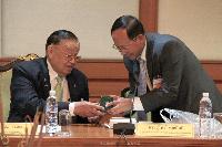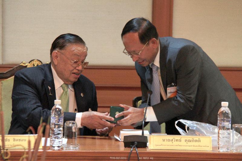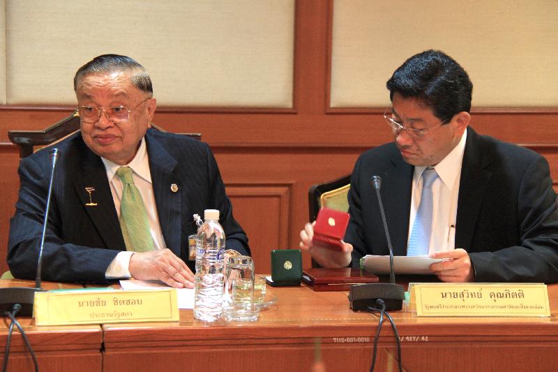 | วันพุธที่ ๑๗ กุมภาพันธ์ ๒๕๕๓ เวลา ๑๓.๐๐ นาฬิกา ณ ห้องรับรอง ๑ ชั้น ๒ อาคารรัฐสภา ๑ นายชัย ชิดชอบ ประธานรัฐสภา เป็นประธานในการหารือการจัดทำเหรียญที่ระลึกในพิธีวางศิลาฤกษ์อาคารรัฐสภาแห่งใหม่ ซึ่งจะจัดขึ้นในวันอังคารที่ ๖ เมษายน ๒๕๕๓ การหารือดังกล่าวมีนายประสพสุข บุญเดช ประธานวุฒิสภา นายสุวิทย์ คุณกิตติ รัฐมนตรีว่าการกระทรวงทรัพยากรธรรมชาติและสิ่งแวดล้อม นายนิคม ไวยรัชพานิช รองประธานวุฒิสภา คนที่หนึ่ง พันเอก อภิวันท์ วิริยะชัย รองประธานสภาผู้แทนราษฎร คนที่สอง นายพิทูร พุ่มหิรัญ เลขาธิการสภาผู้แทนราษฎร นางสุวิมล ภูมิสิงหราช เลขาธิการวุฒิสภา นางจันทร์เพ็ญ อานามวัฒน์ ผู้อำนวยการสำนักบริหารงานกลาง และนายประสิทธิ์ อนันตวิรุฬห์ ผู้อำนวยการสำนักการคลังและงบประมาณ ร่วมหารือกับนายเทวัญ วิชิตะกุล อธิบดีกรมธนารักษ์ นายสันติ จันทร์แสงศรี ผู้อำนวยการสำนักกษาปณ์ นางปนัสย์สร อริยวงศ์ ผู้อำนวยการสำนักบริหารที่ราชพัสดุกรุงเทพมหานคร นายวุฒิชัย แสงเงิน ผู้อำนวยการส่วนศิลปกรรม และนายอภิรักษ์ คำสกุล นักจัดการทั่วไปชำนาญการ |