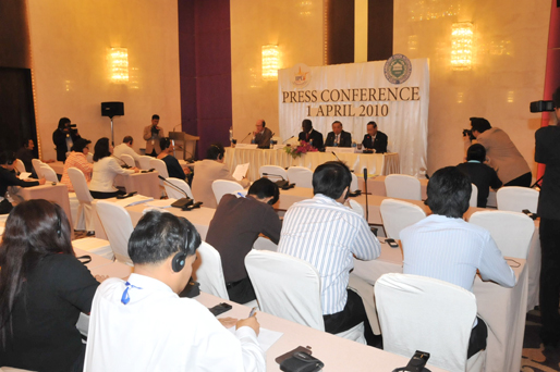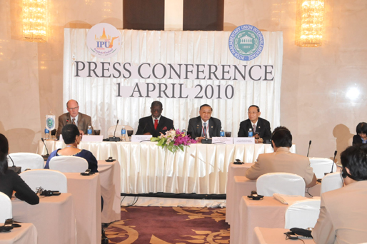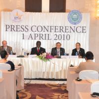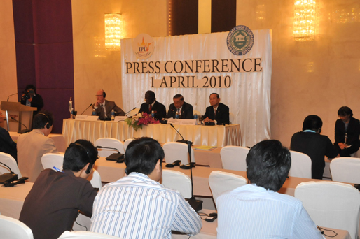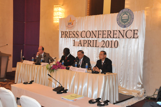 | วันพฤหัสบดีที่ ๑ เมษายน ๒๕๕๓ เวลา ๑๓.๐๐ นาฬิกา ณ ห้องประชุม World Ball-room C ชั้น ๒๓ โรงแรมเซ็นทรา แกรนด์ กรุงเทพมหานคร นายชัย ชิดชอบ ประธานรัฐสภา และประธานสภาผู้แทนราษฎร แถลงข่าวปิดการประชุมสมัชชาสหภาพรัฐสภาครั้งที่ ๑๒๒ และการประชุมสมาคมเลขาธิการรัฐสภา ประจำฤดูใบไม้ผลิ ปี ๒๕๕๓ โดยมีนายประสพสุข บุญเดช ประธานวุฒิสภา ดร.Theo-Ben Gurirab ประธานสหภาพรัฐสภา และนาย James Jennings ผู้อำนวยการฝ่ายประชาสัมพันธ์ สหภาพรัฐสภา เข้าร่วมการแถลงข่าว |